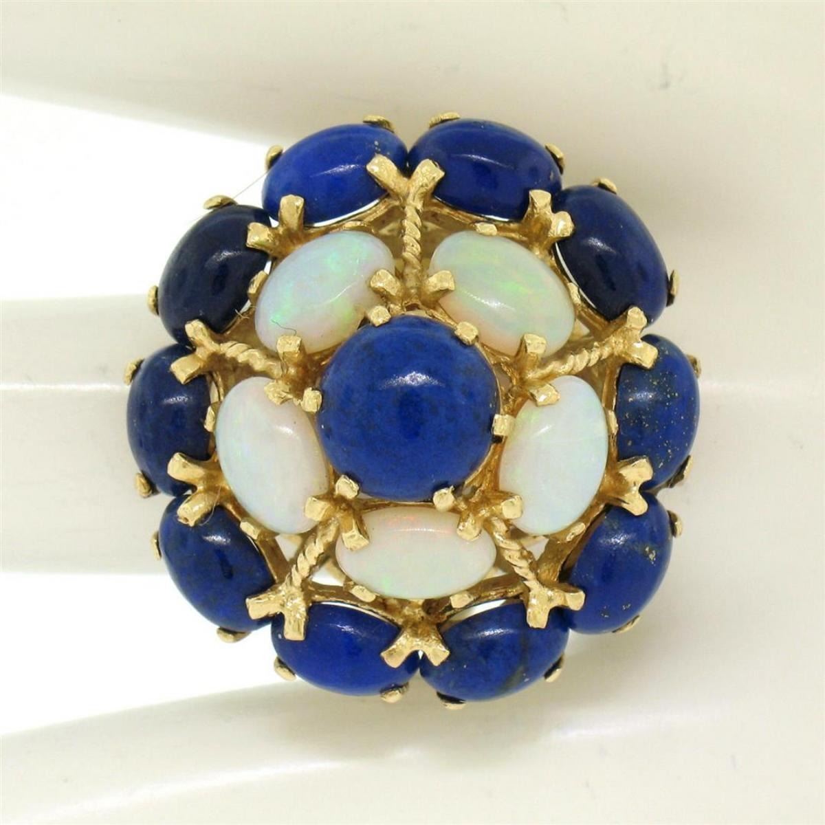 One Large Vintage 14k Yellow Gold Opal & Lapis Flower Cluster Dome Cocktail Ring. Item Details: Material: Solid 14k Yellow Gold, Weight: 10.61 Grams, Stone(s): (1) Natural Genuine Lapis Lazuli - Round Cabochon Cut - Prong Set - Deep Rich Blue Color - 7.86mm (approx.), (5) Natural Genuine Opal - Oval Cabochon Cut - Prong Set - Off White w/ Red, Green, and Blue Play - 6.93x4.67mm (approx.), (10) Natural Genuine Lapis Lazuli - Oval Cabochon Cut - Prong Set - Deep Rich Blue Color - 6.96x4.87mm (approx.), Ring Size: 7.0, Ring Diameter: 25.875mm (average), Ring Height: 15.13mm rise off the finger. Condition: Vintage piece. Excellent condition!