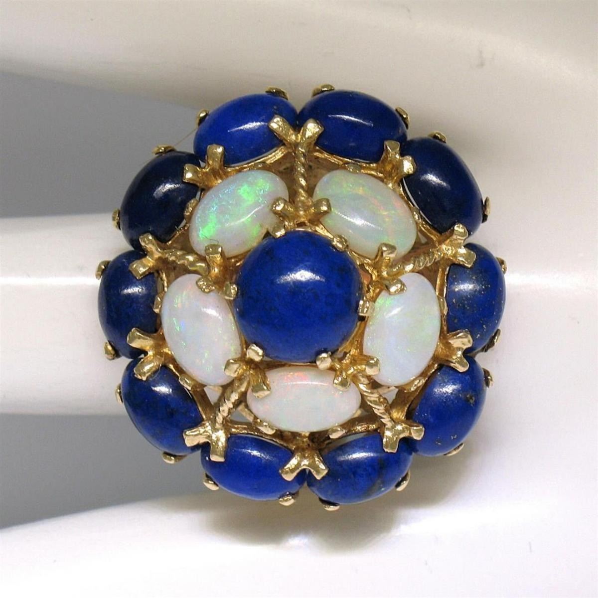 One Large Vintage 14k Yellow Gold Opal & Lapis Flower Cluster Dome Cocktail Ring. Item Details: Material: Solid 14k Yellow Gold, Weight: 10.61 Grams, Stone(s): (1) Natural Genuine Lapis Lazuli - Round Cabochon Cut - Prong Set - Deep Rich Blue Color - 7.86mm (approx.), (5) Natural Genuine Opal - Oval Cabochon Cut - Prong Set - Off White w/ Red, Green, and Blue Play - 6.93x4.67mm (approx.), (10) Natural Genuine Lapis Lazuli - Oval Cabochon Cut - Prong Set - Deep Rich Blue Color - 6.96x4.87mm (approx.), Ring Size: 7.0, Ring Diameter: 25.875mm (average), Ring Height: 15.13mm rise off the finger. Condition: Vintage piece. Excellent condition!