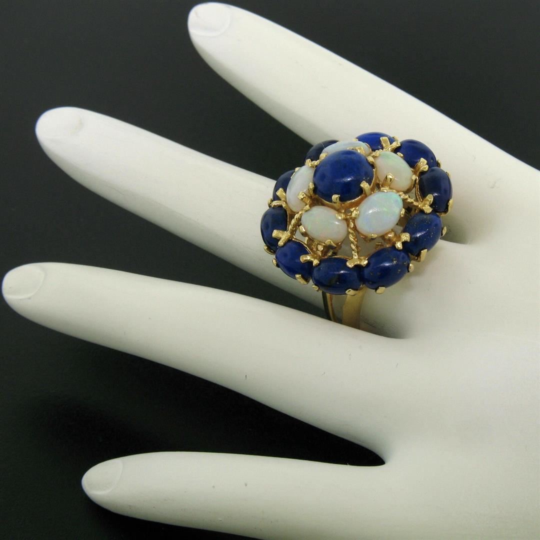 One Large Vintage 14k Yellow Gold Opal & Lapis Flower Cluster Dome Cocktail Ring. Item Details: Material:  Solid 14k Yellow Gold, Weight:  10.61 Grams, Stone(s):  (1) Natural Genuine Lapis Lazuli - Round Cabochon Cut - Prong Set - Deep Rich Blue Color - 7.86mm (approx.), (5) Natural Genuine Opal - Oval Cabochon Cut - Prong Set - Off White w/ Red, Green, and Blue Play - 6.93x4.67mm (approx.), (10) Natural Genuine Lapis Lazuli - Oval Cabochon Cut - Prong Set - Deep Rich Blue Color - 6.96x4.87mm (approx.), Ring Size:  7.0, Ring Diameter:  25.875mm (average), Ring Height:  15.13mm rise off the finger. Condition:  Vintage piece. Excellent condition!