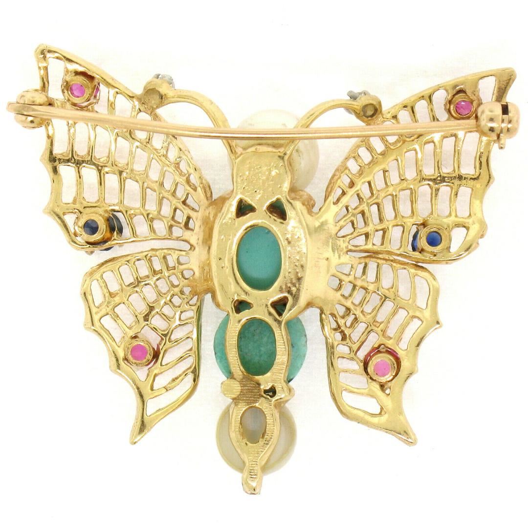 One 14k Yellow Gold Open Turquoise Pearl Sapphire Ruby Diamond Butterfly Brooch Pin. Item Details: Material: Solid 14k Yellow Gold, Weight: 7.16 Grams, Stone(s): (2) Natural Genuine Turquoise - Round Cabochon Cut - Prong Set - Light Turquoise Color - 1.84mm and 2.44mm (approx.), (2) Genuine Cultured Pearls - Round Shape - Stem and Prong Set - Beige to Golden Color - 1.00mm and 1.76mm (approx.), (2) Natural Genuine Sapphires - Round Cut - Prong Set - Deep Royal Blue Color - 0.18ctw (approx.), (4) Natural Genuine Rubies - Round Cut - Prong Set - Light Red Color - 0.28ctw (approx.), (2) Natural Genuine Diamonds - Round Single Cut - Prong Set - G Color - VS2 Clarity - 0.04ctw (approx.), Total Carat Weight: 0.50 (approx.) Height: 28.60mm Width: 30.86mm Thickness: 2.80mm Condition: Like New!
