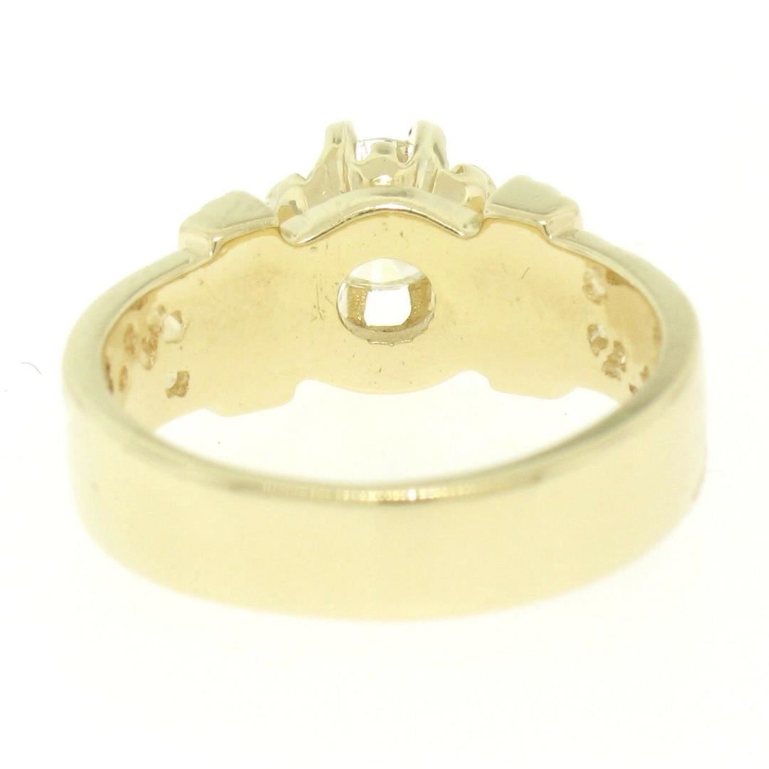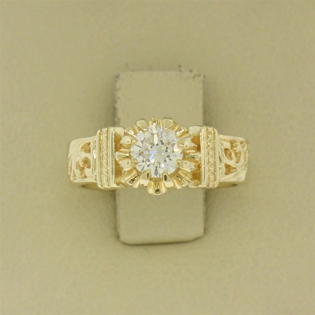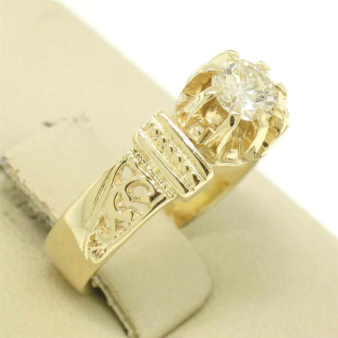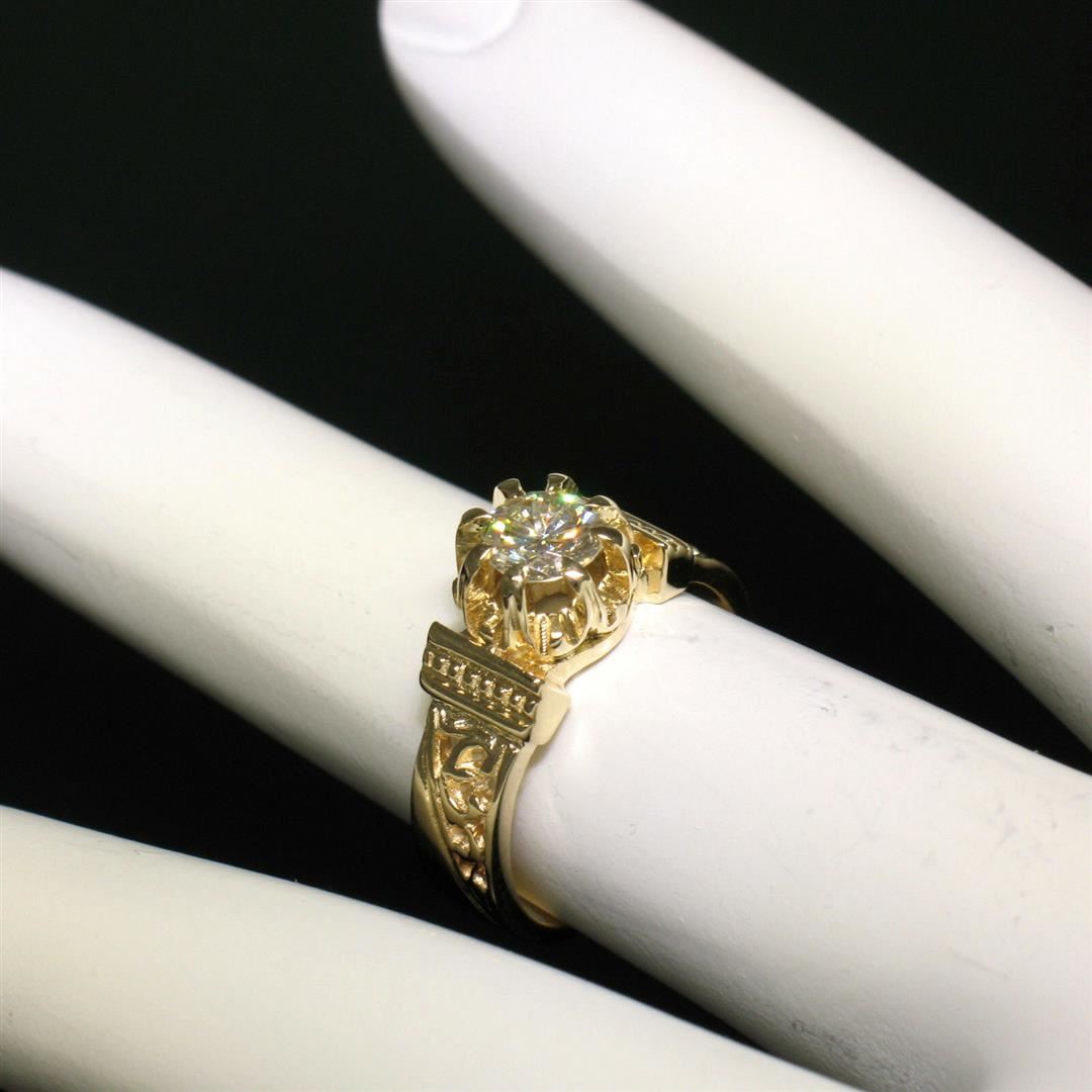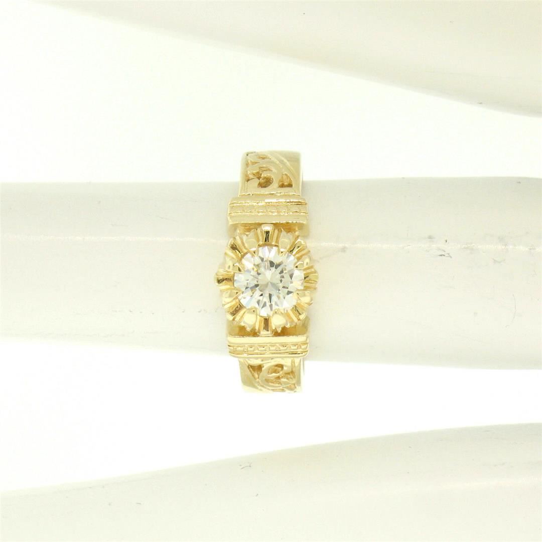 One 14k Yellow Gold Open Work 0.43ct G VVS1 Round Brilliant Diamond Solitaire Ring. Item Details: Material: 14k Solid Yellow Gold, Weight: 4.3 Grams, Stone(s): (1) Natural Genuine Diamond - Round Brilliant Cut - Prong Set - G/H Color - VVS1 Clarity, Total Carat Weight: 0.43 (approx.), Ring Size: 5.5 , Ring Width: 7.30mm, Ring Height: 5.99mm rise off the finger, Condition: Vintage estate piece. Beautiful, like new condition. 100% ready to wear!