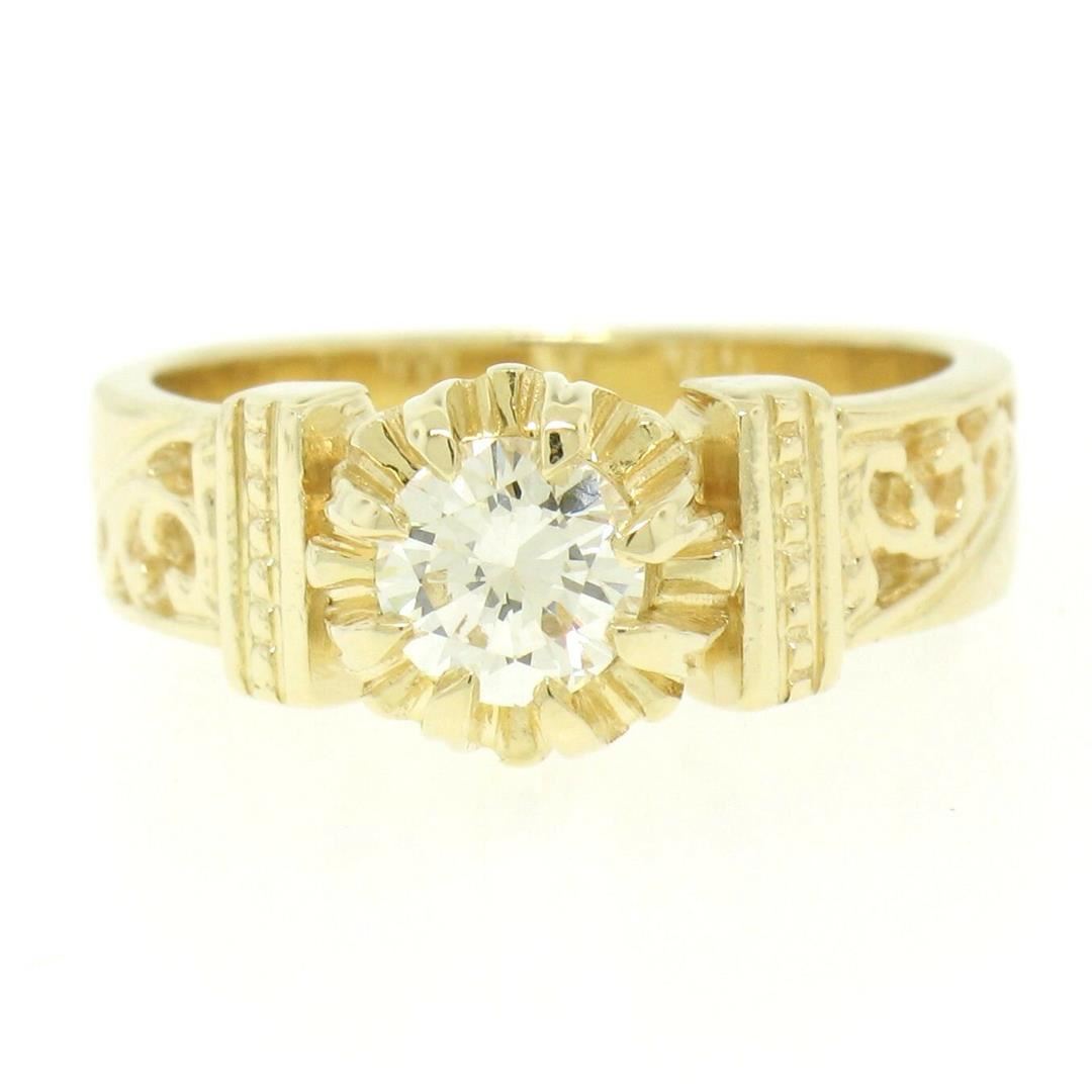 One 14k Yellow Gold Open Work 0.43ct G VVS1 Round Brilliant Diamond Solitaire Ring. Item Details: Material: 14k Solid Yellow Gold, Weight: 4.3 Grams, Stone(s): (1) Natural Genuine Diamond - Round Brilliant Cut - Prong Set - G/H Color - VVS1 Clarity, Total Carat Weight: 0.43 (approx.), Ring Size: 5.5 , Ring Width: 7.30mm, Ring Height: 5.99mm rise off the finger, Condition: Vintage estate piece. Beautiful, like new condition. 100% ready to wear!