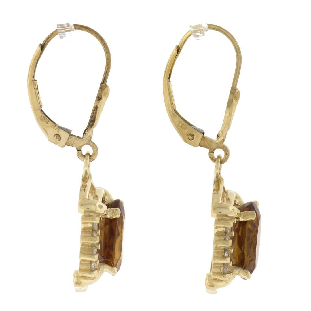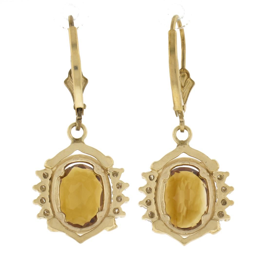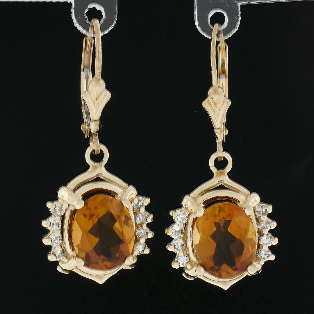 A solid 14k yellow gold drop dangle earrings, with 2 oval cut natural citrines (9.6x7.8mm each), and 16 round cut natural diamonds ( 0.20ctw). The earrings measure approximately 33x14.3mm and weigh a total of 5.25 grams.