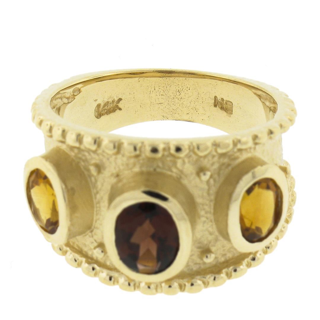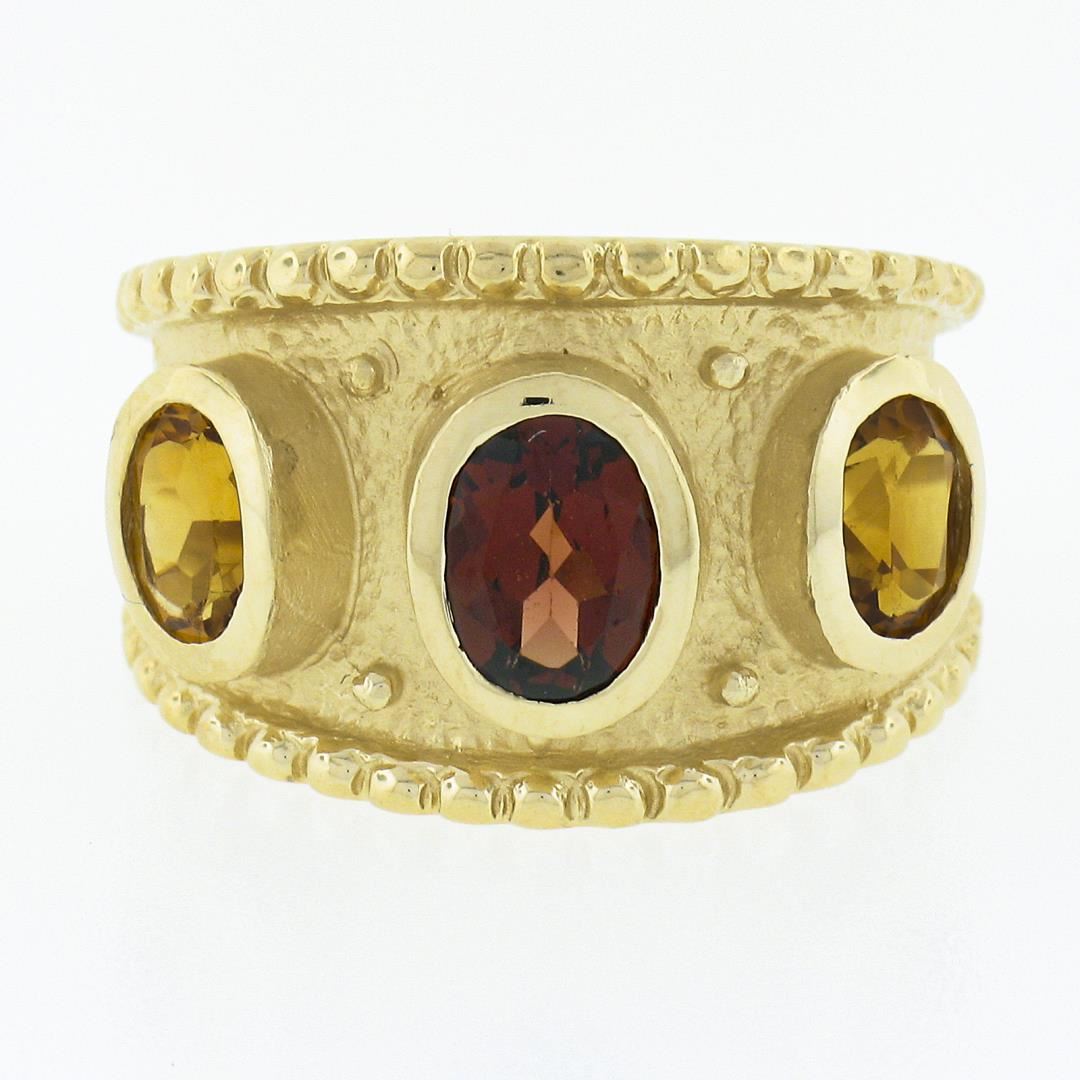 A solid 14k yellow gold band cigar ring. with 1 oval cut natural garnet (6.7x5mm / 1.0ct), and 2 oval cut natural citrines (5.7x4mm / 1.0ctw ). The ring is size 6.5, weighs a total of 7.93 grams, and measures 14mm wide.