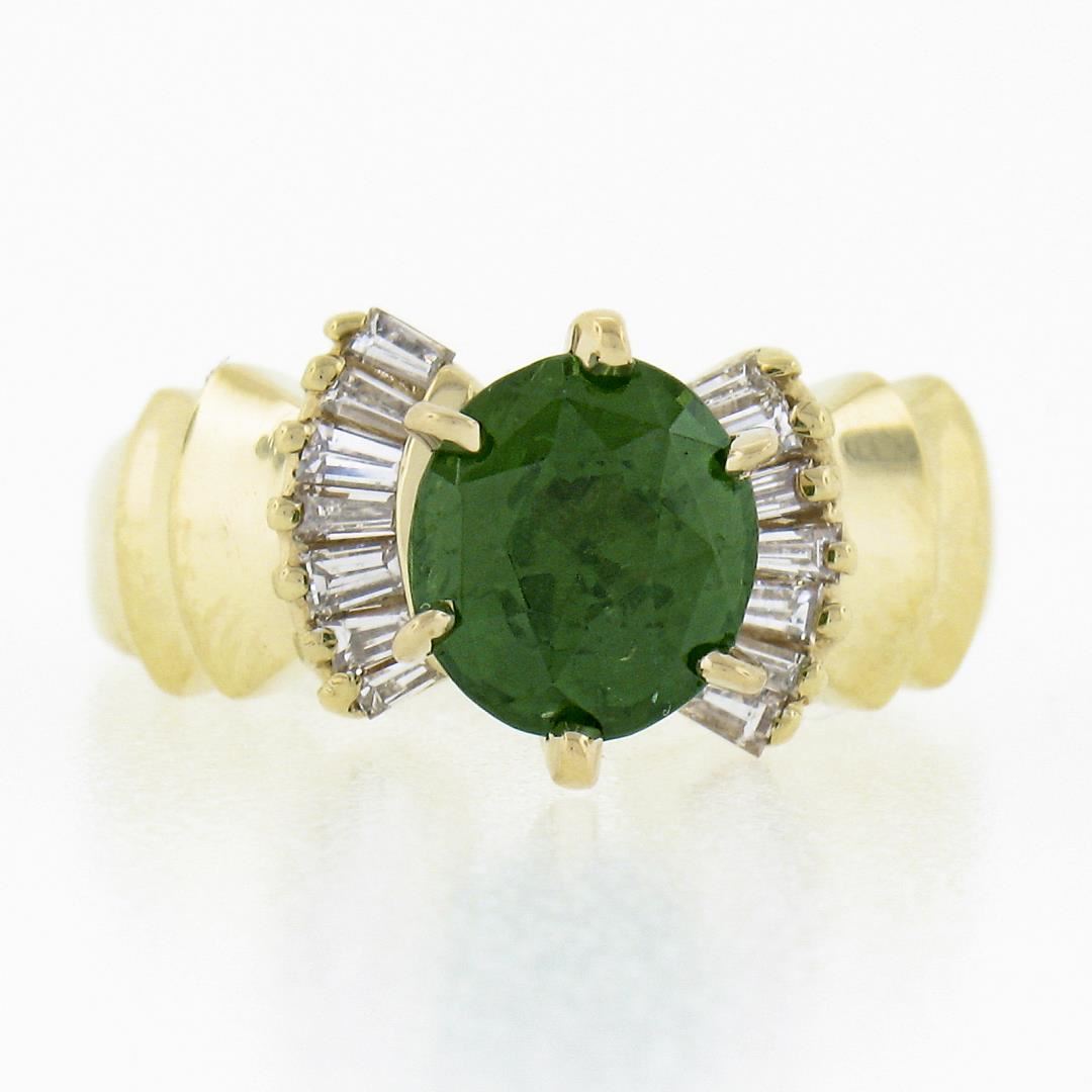 A solid 14k yellow gold ring, with 1 oval cut natural peridot (7.4x6.8mm ), and 14 tapered baguette cut natural diamonds (H/I - VS2/SI2 ; 0.30ctw). The ring is size 4.5, weighs a total of 5.88 grams, and measures 9.4mm wide.