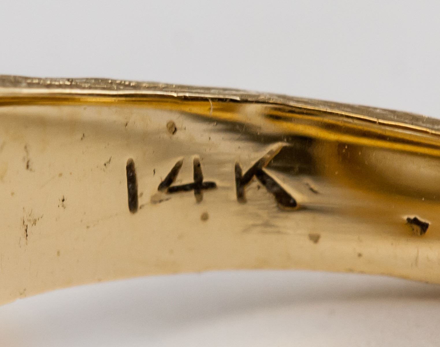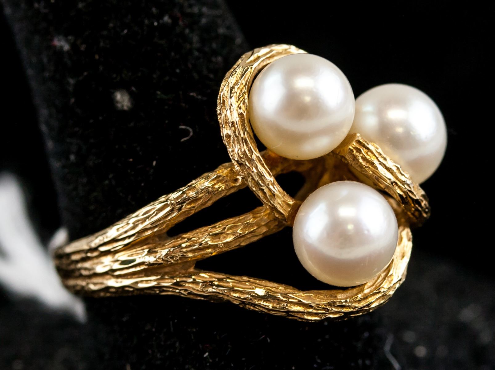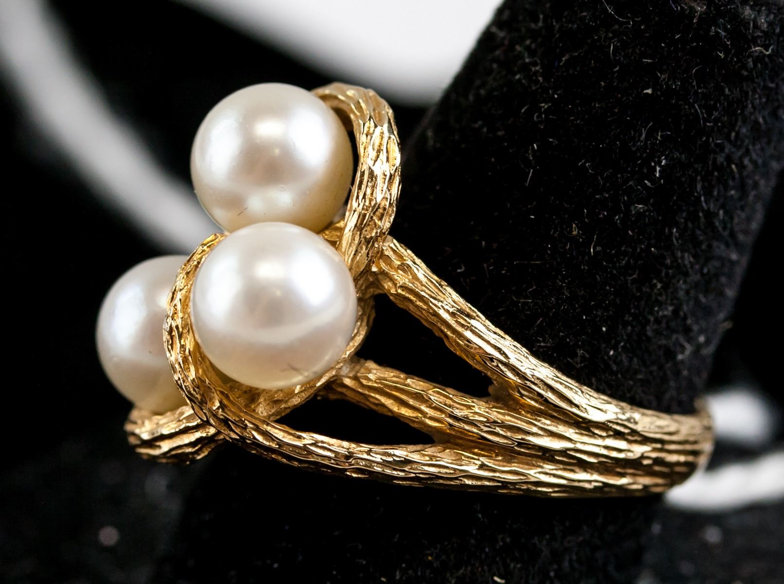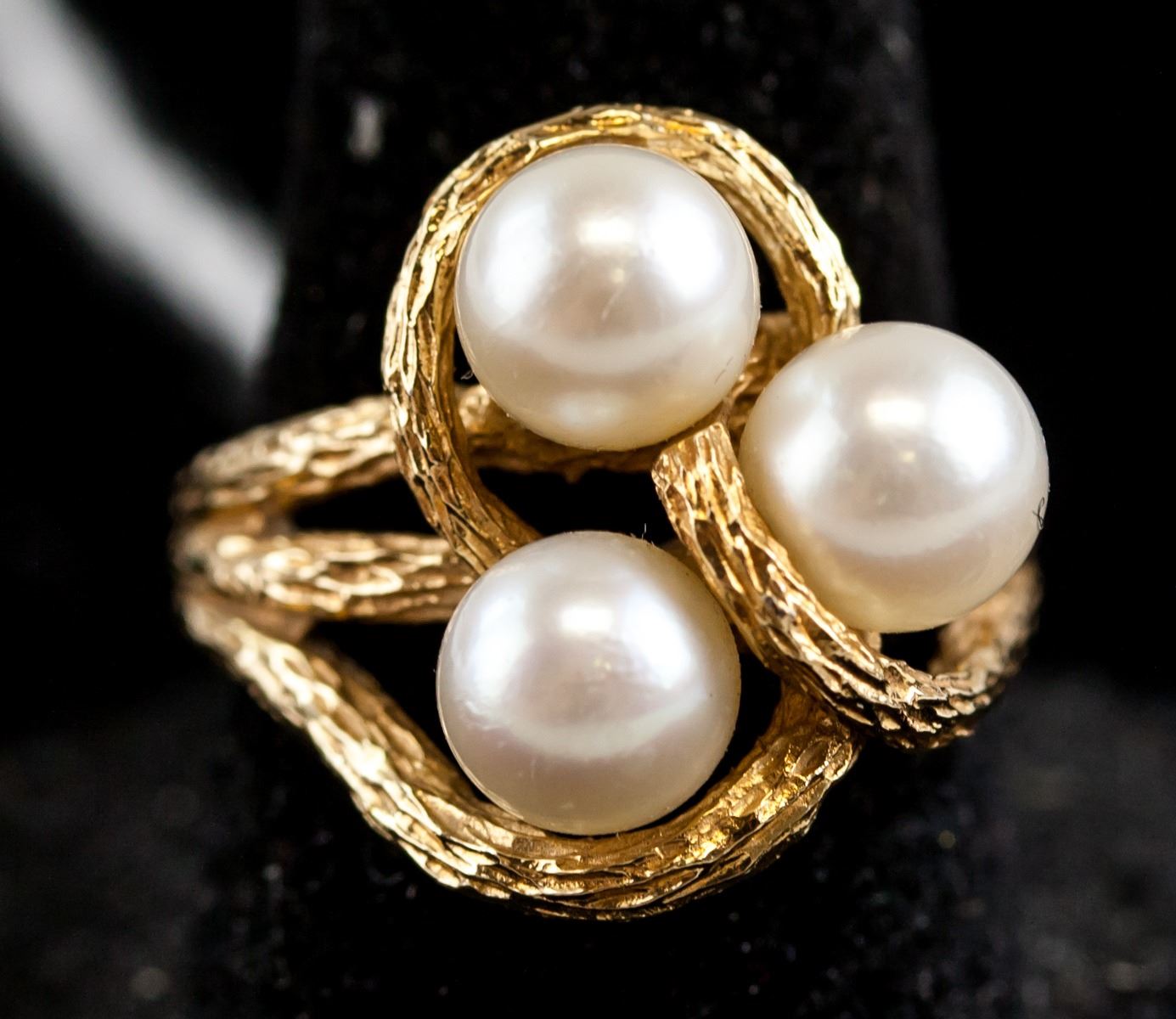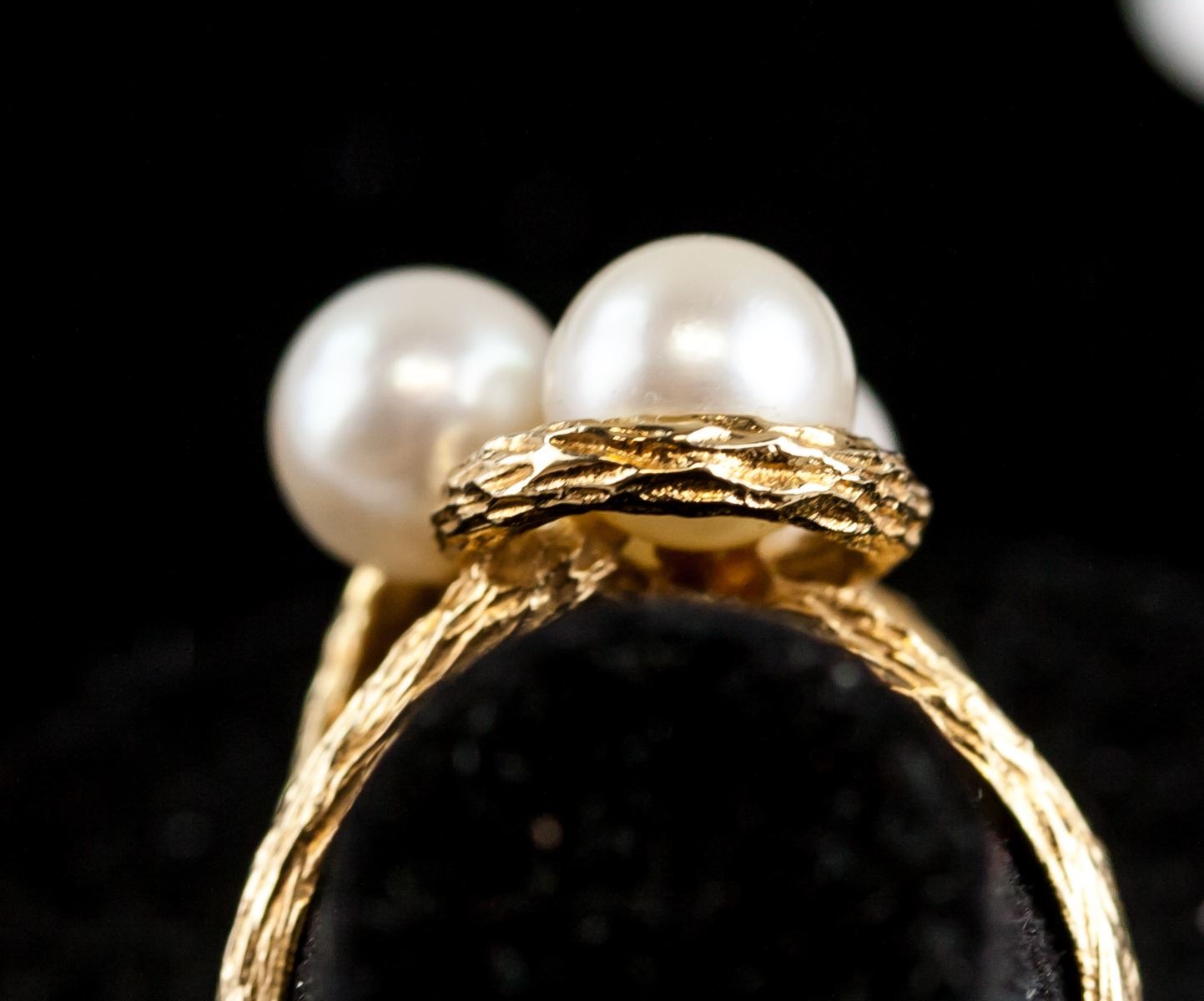 Stamped 14k yellow gold ring set with 3 pearls. Ring Size: 6.75, 1.8 x 1.7 cm