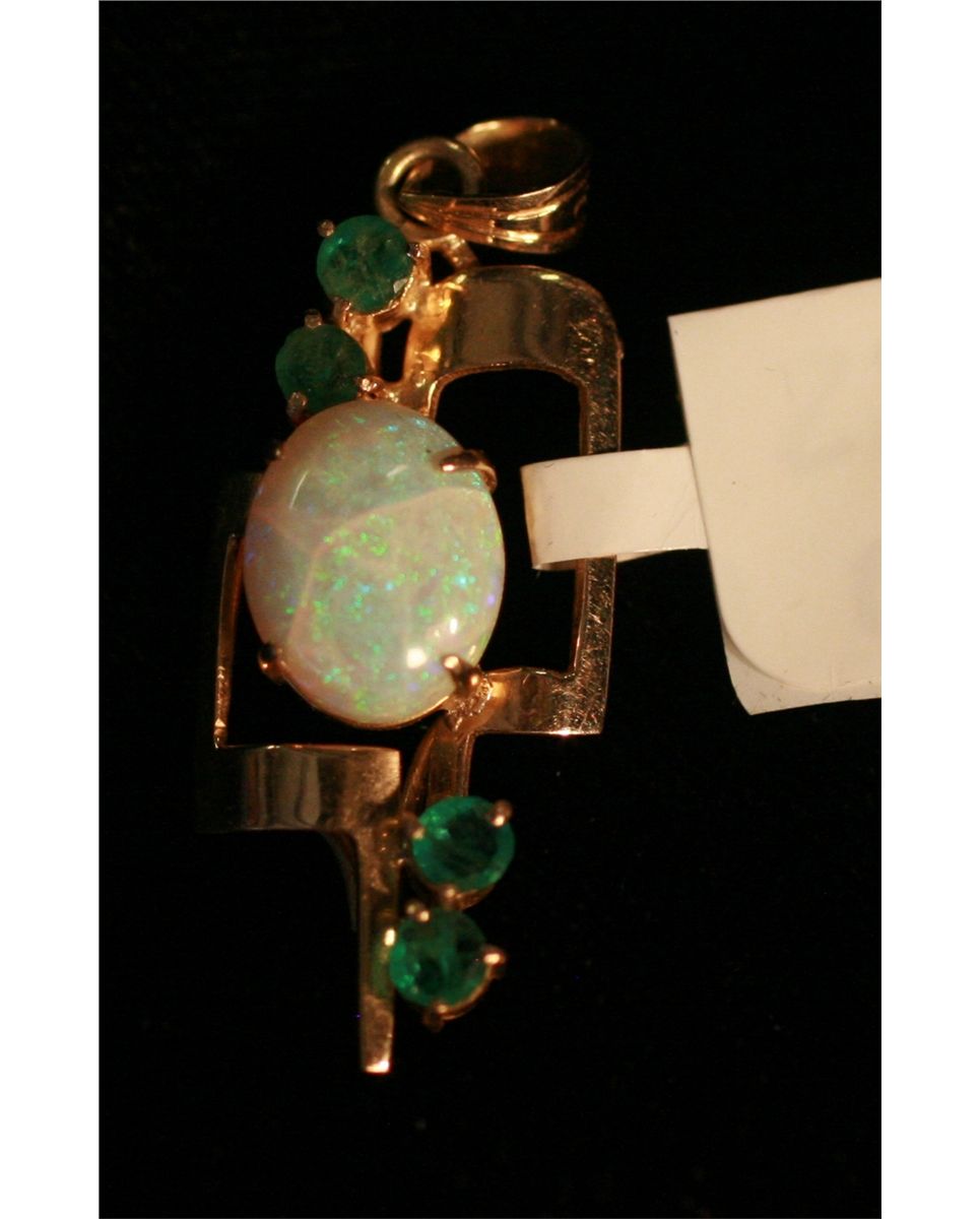 14k Yellow Gold Pendant, Prong set with one oval shaped cabochon cut opal, ( crazed and cracked, no value) and Four 2.5mm round faceted low quality emeralds, Total weight 2.3 grams, -227060-
