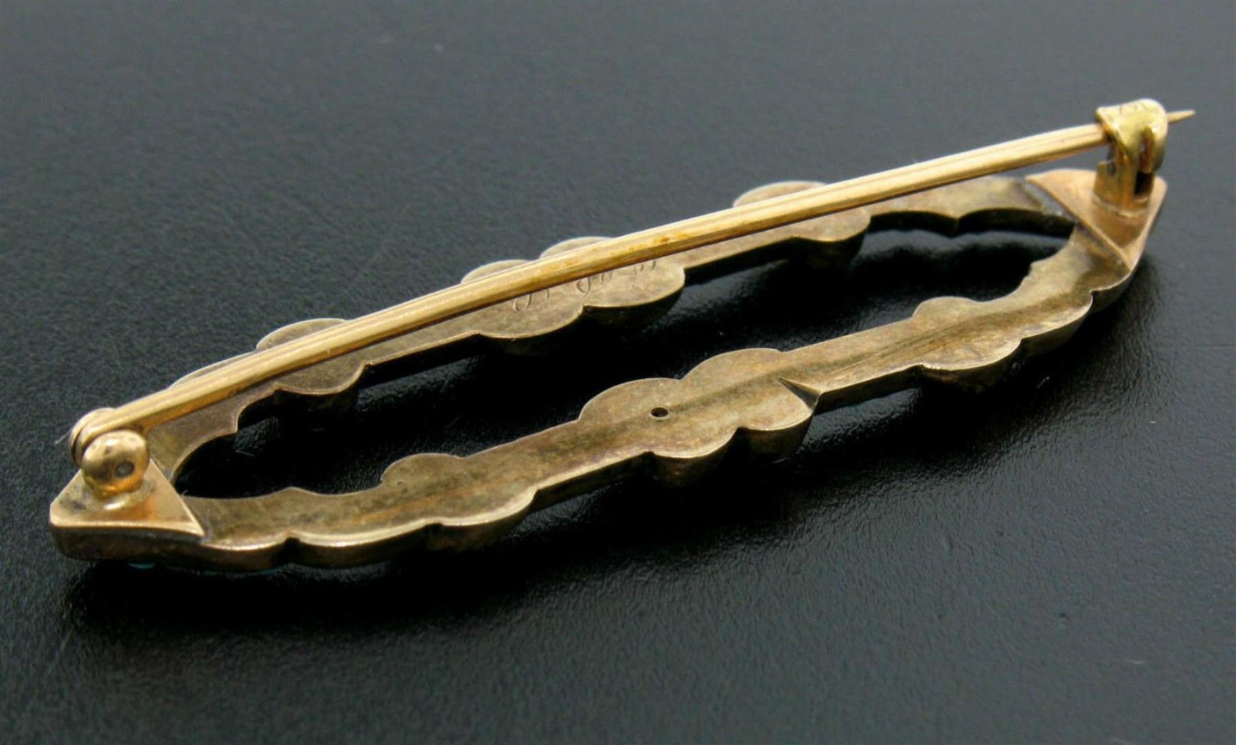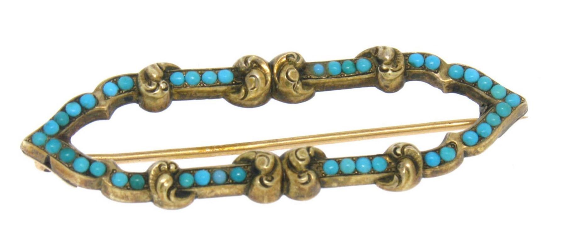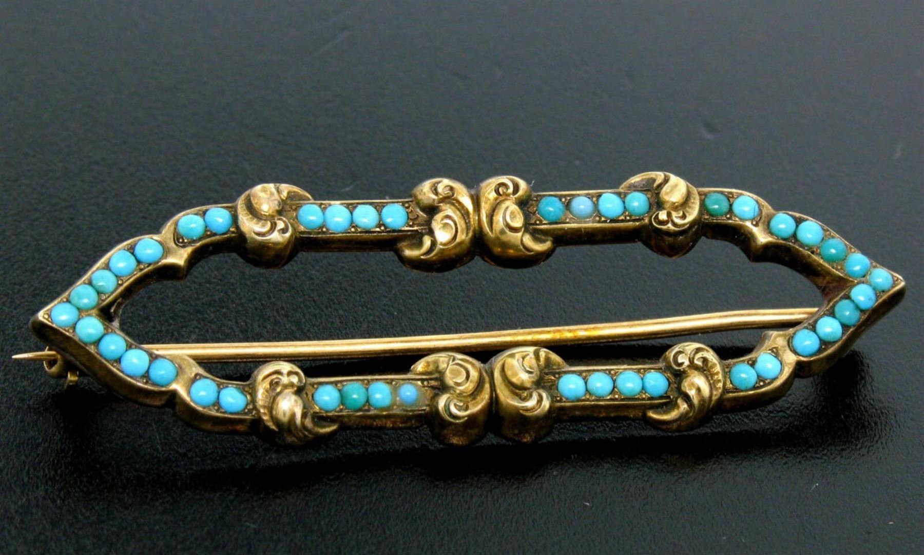 One Antique Victorian 14k Yellow Gold Persian Turquoise Open Marquise Brooch Pin. Item Details: Material: Solid 14k Yellow Gold, Total Weight: 7.0 Grams, Stone(s): (42) Natural Genuine Persian Turquoise - Polished Round Bead Cut - Rich Turquoise Blue Color, Overall Height: 17.80mm, Overall Width: 55.18mm, Backing: Pin Back w/ Lever Closure, Engraving: "E. P. Lee", Condition: Antique, Victorian era piece. Excellent condition!