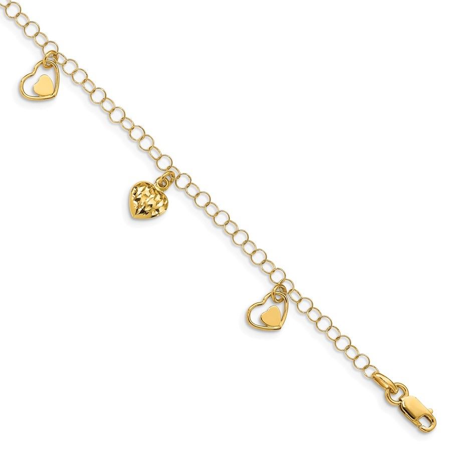 14k Yellow Gold Polished & D/C Hearts Bracelet - 7 in.