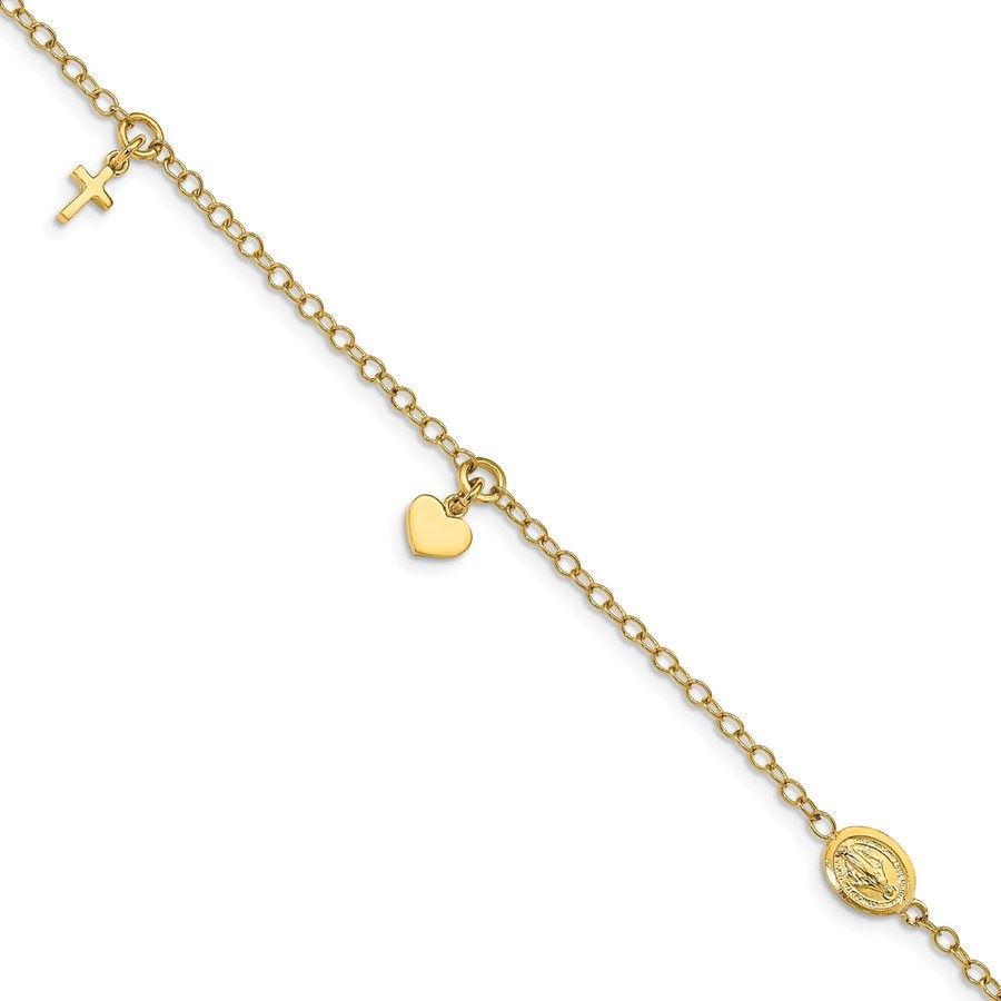 14k Yellow Gold Polished Heart Cross Religious Bracelet - 7 in.