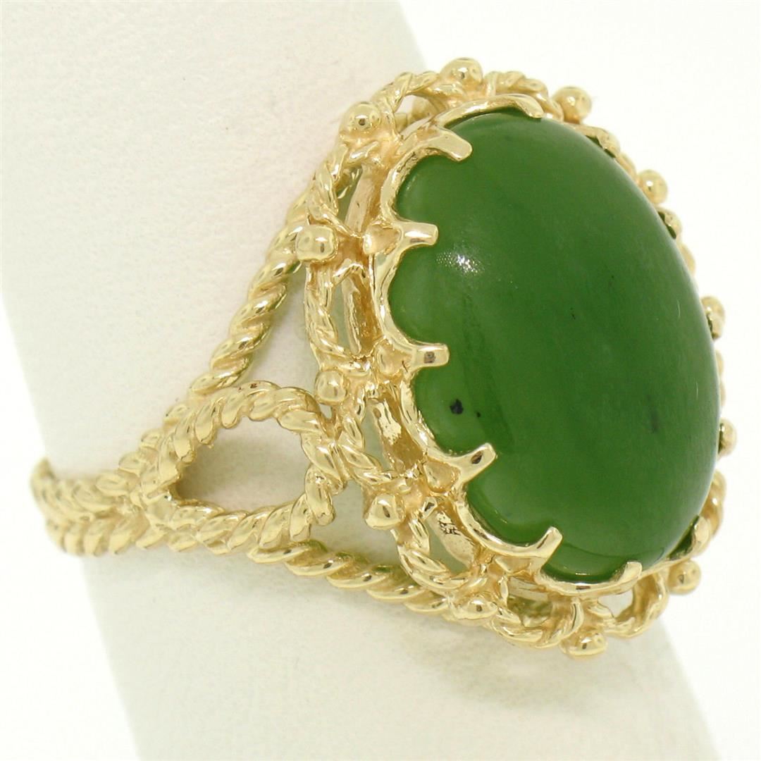 One 14k Yellow Gold Prong Set Cabochon Olive Green Nephrite Jade Twisted Wire Ring. Item Details - Material: 14k Solid Yellow Gold, Weight: 6.2 Grams, Stone(s): (1) Natural Genuine Nephrite (Jade) - Oval Cabochon Cut - Multi Prong Set - Very Nice, Uniform, Olive Green Color - 16x12mm (approx.), Total Carat Weight: 6.2 (approx.), Ring Size: 7.0, Ring Width: 20mm, Ring Height: 8.75mm rise off the finger, Condition: Estate piece. The jade shows some light abrasion from years of wear. (Expected from an estate piece.) Great overall condition!