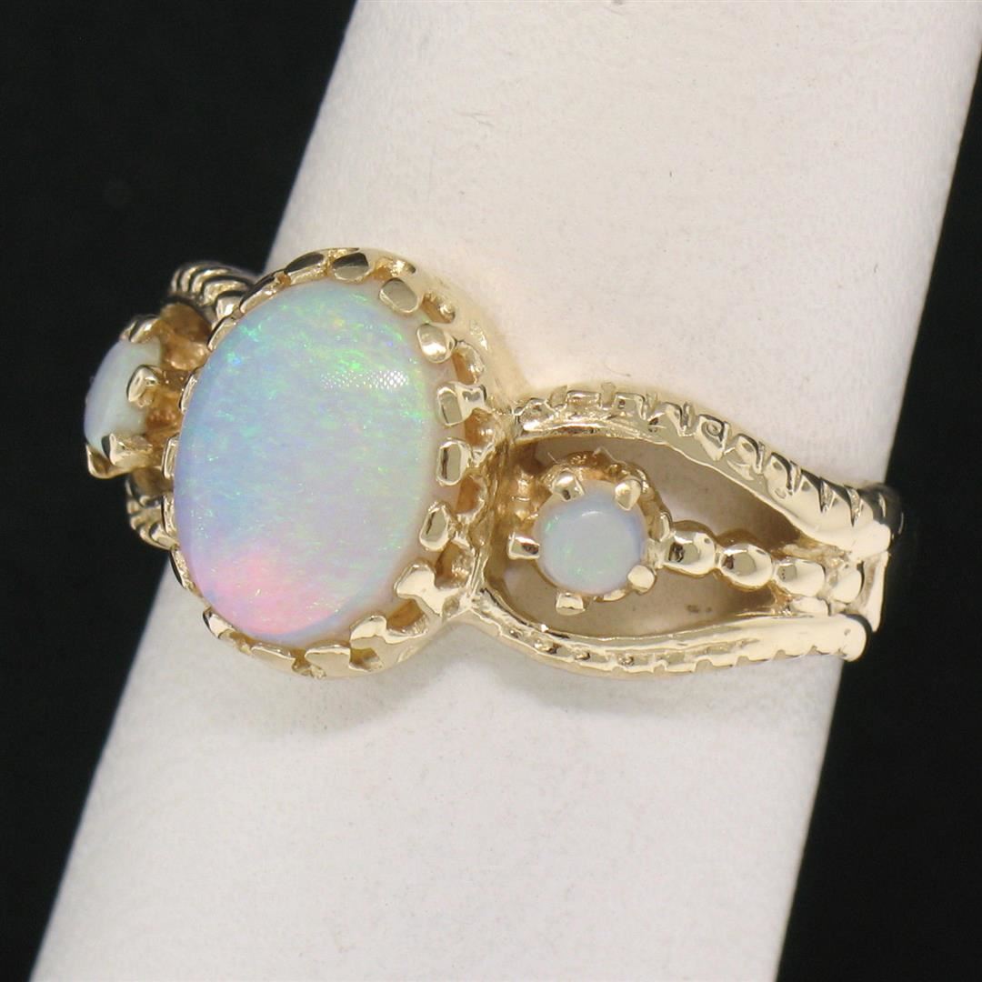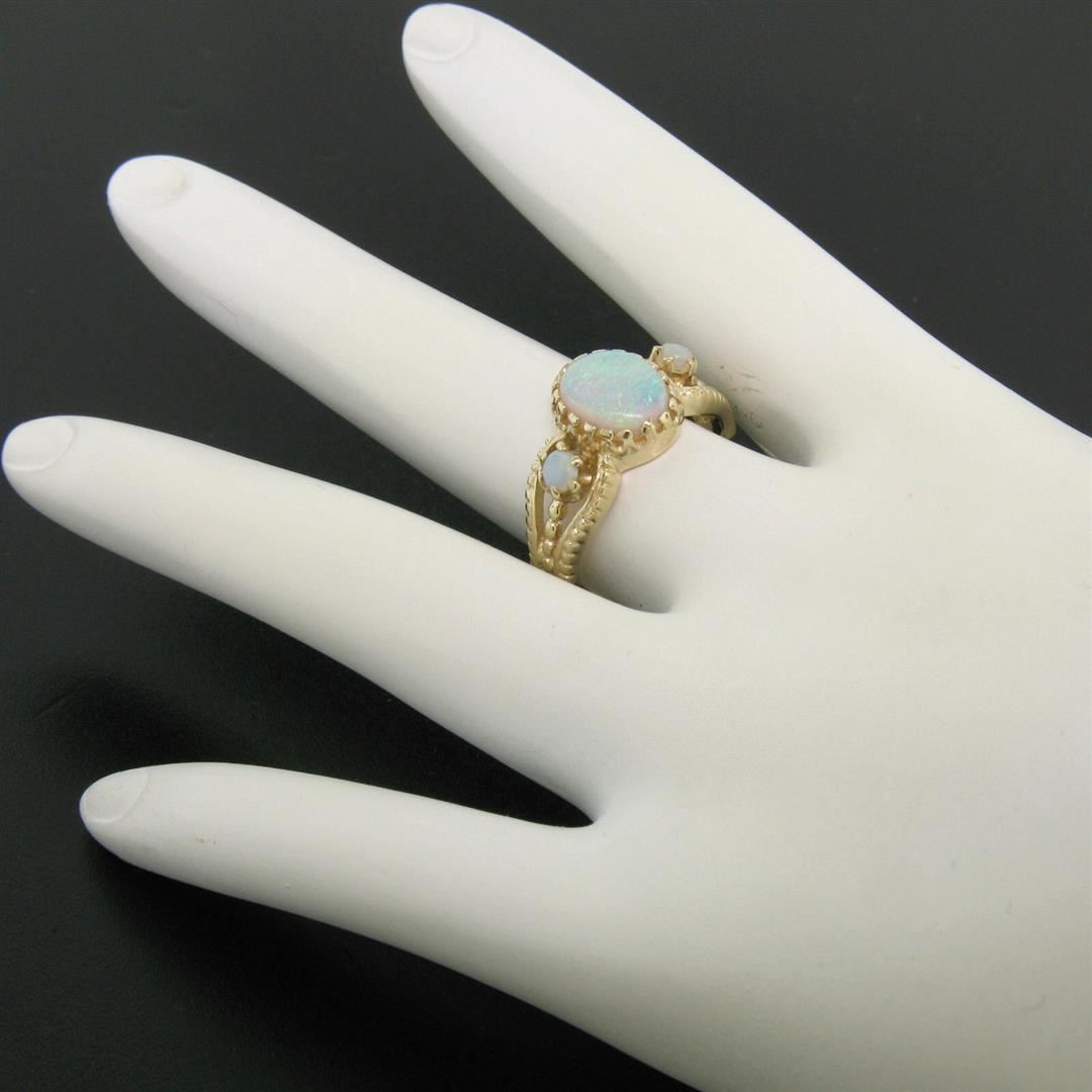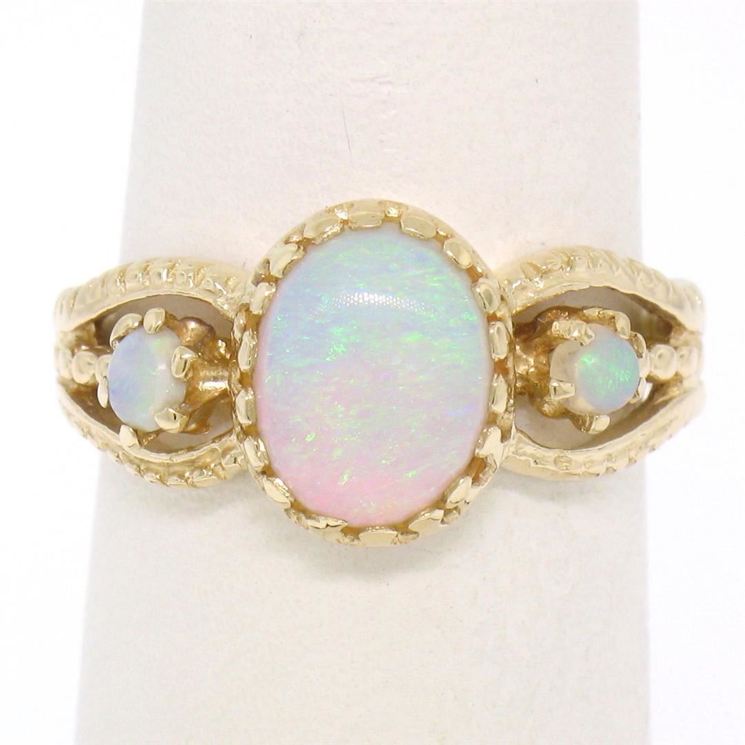 This gorgeous split shank band ring is crafted in solid 14k yellow gold and features 3 beautiful cabochon opals. The center opal is oval in shape and measures approximately 9.70x7.39mm. The center opal is flanked on either side by smaller, approximately 3.1mm round opals. each of the three opals in this ring show wonderful plays of green, violet, and red color. The shank is split into three sections and features a simple ribbed pattern. Enjoy!