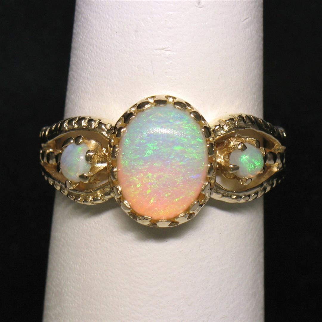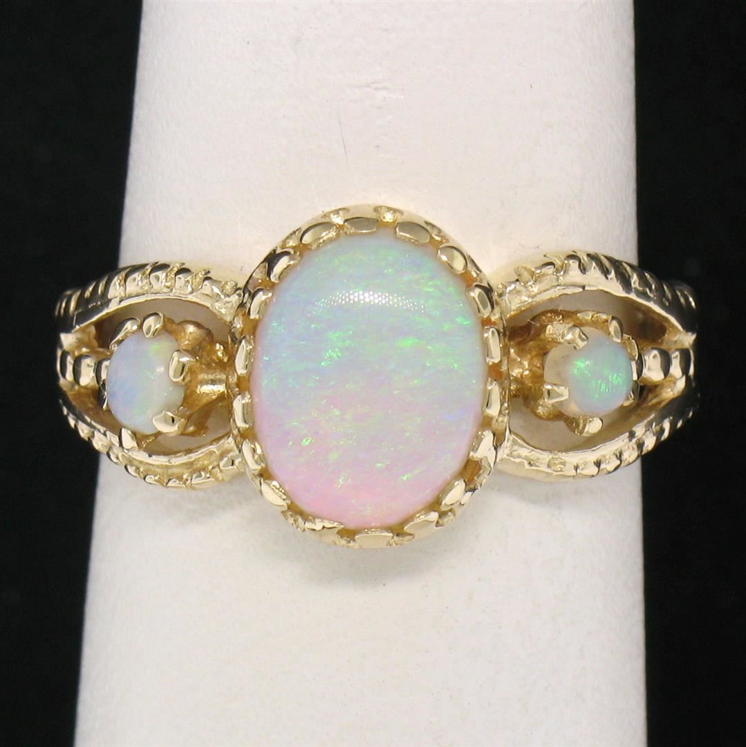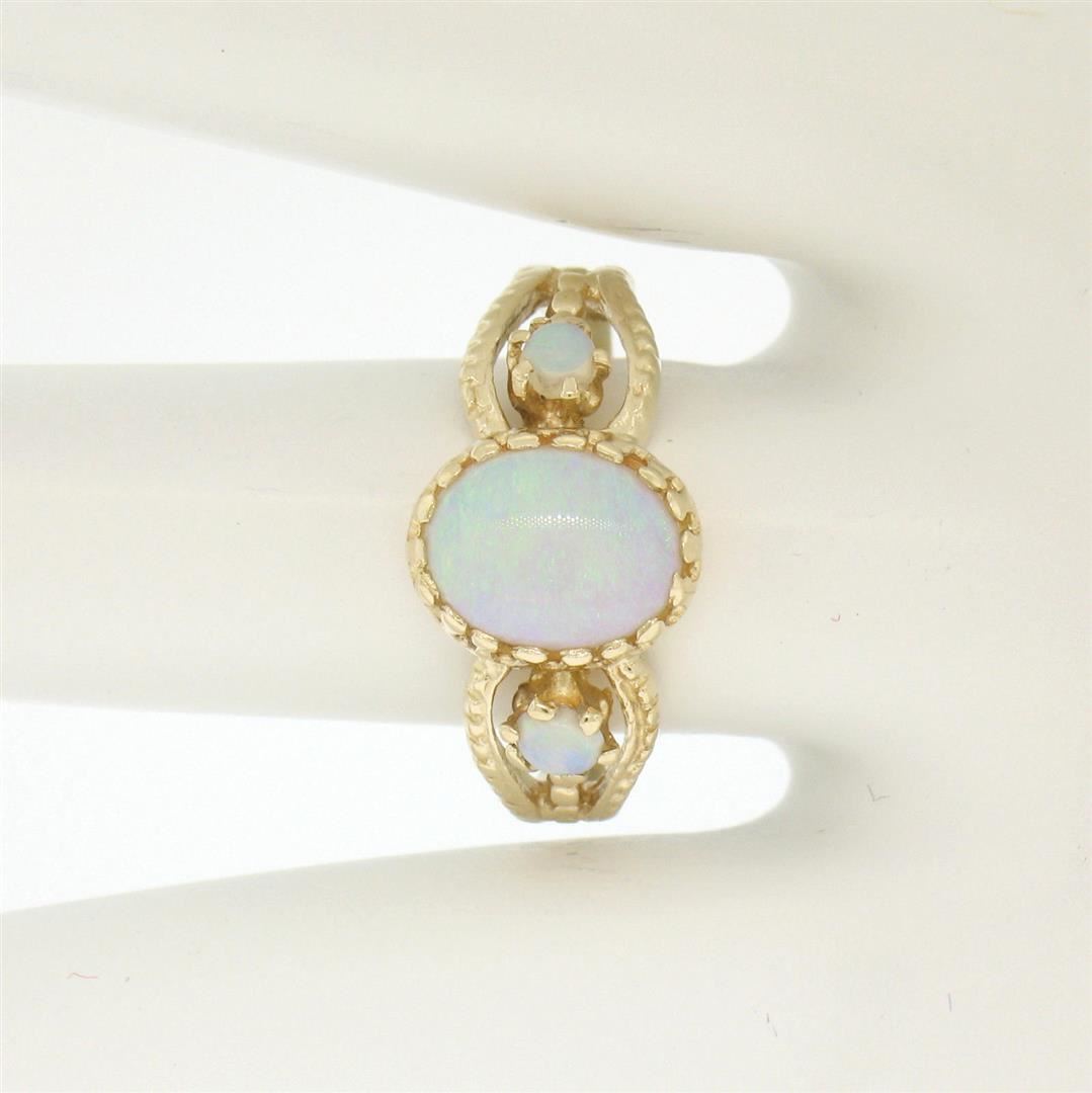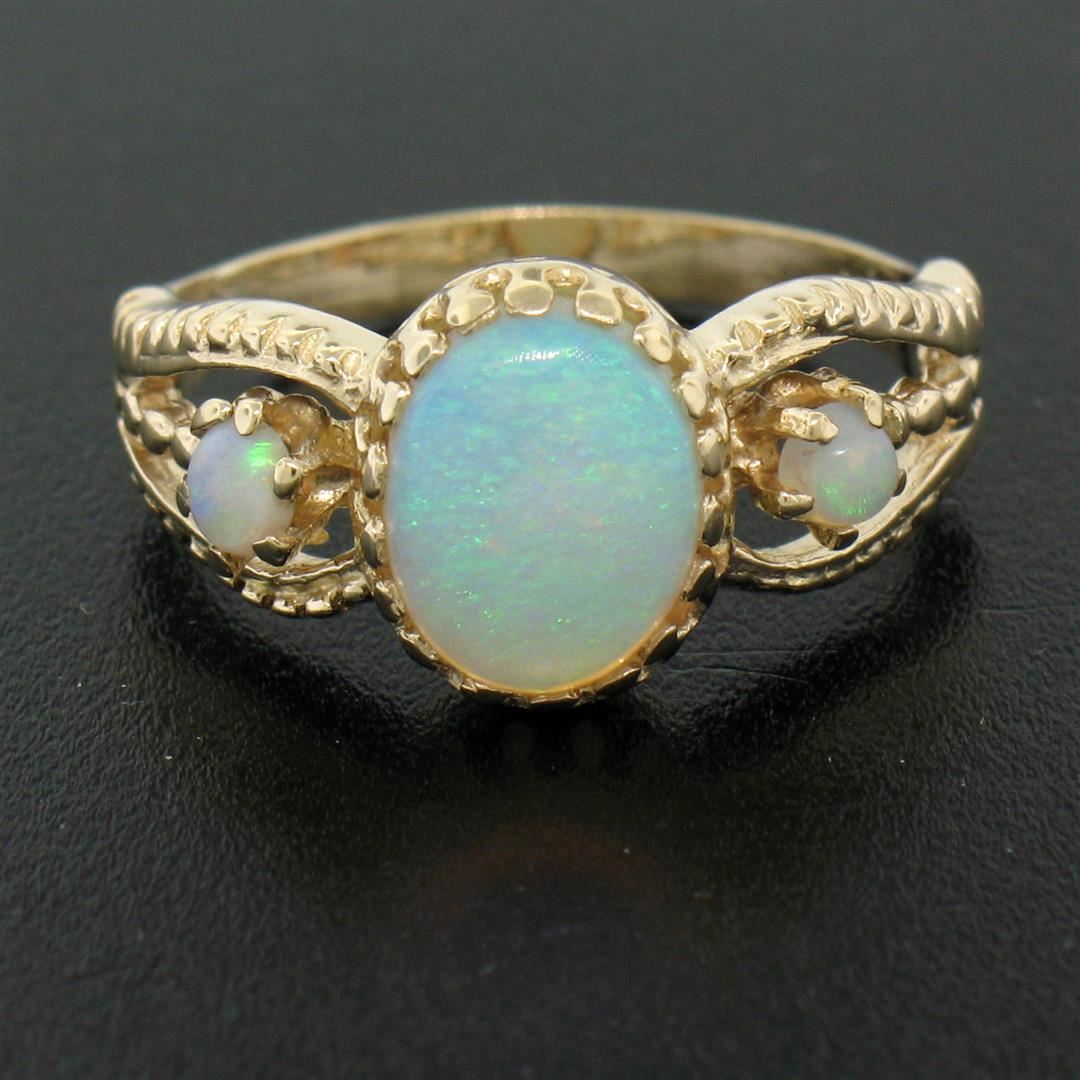 This gorgeous split shank band ring is crafted in solid 14k yellow gold and features 3 beautiful cabochon opals. The center opal is oval in shape and measures approximately 9.70x7.39mm. The center opal is flanked on either side by smaller, approximately 3.1mm round opals. each of the three opals in this ring show wonderful plays of green, violet, and red color. The shank is split into three sections and features a simple ribbed pattern. Enjoy!