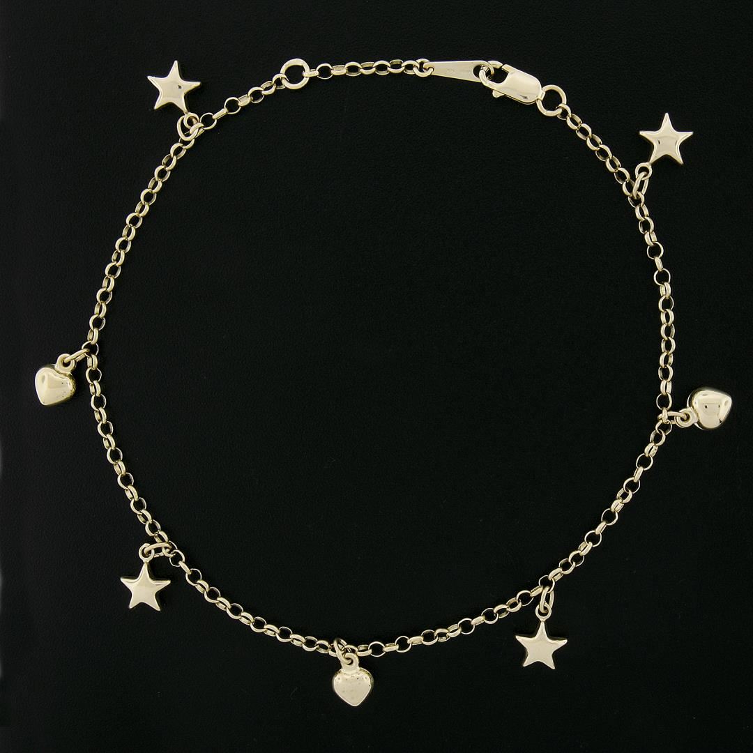 A solid 14k yellow gold dangle anklet bracelet. It weighs a total of 5.01 grams, measures 11.8mm wide at the star dangle, and measures adjustable at 9.25" or 10.25 inches in length.