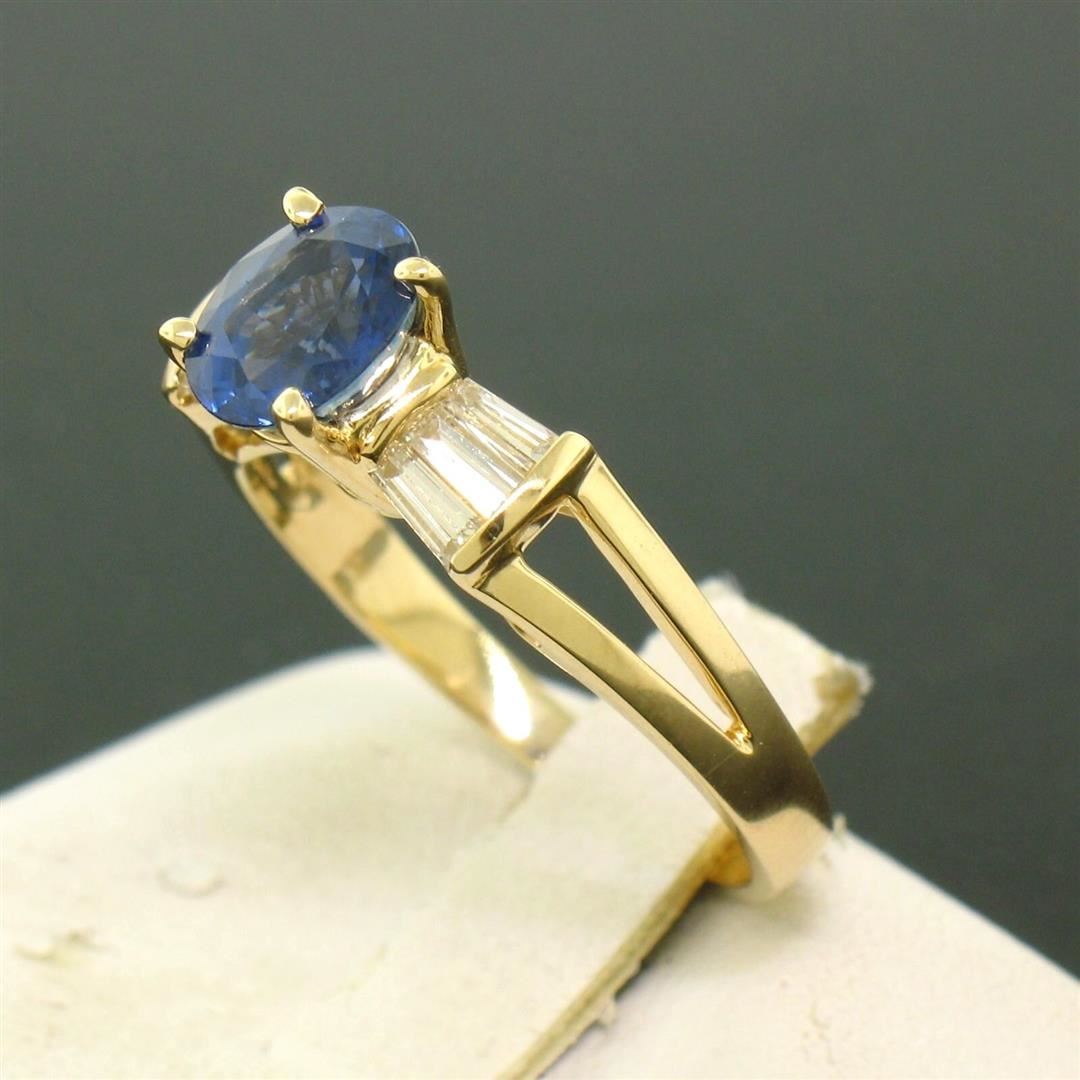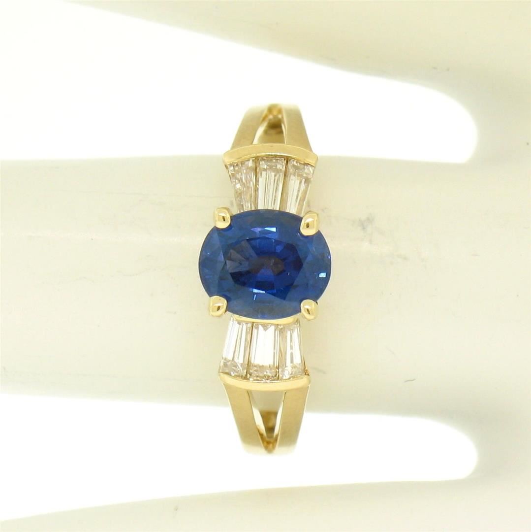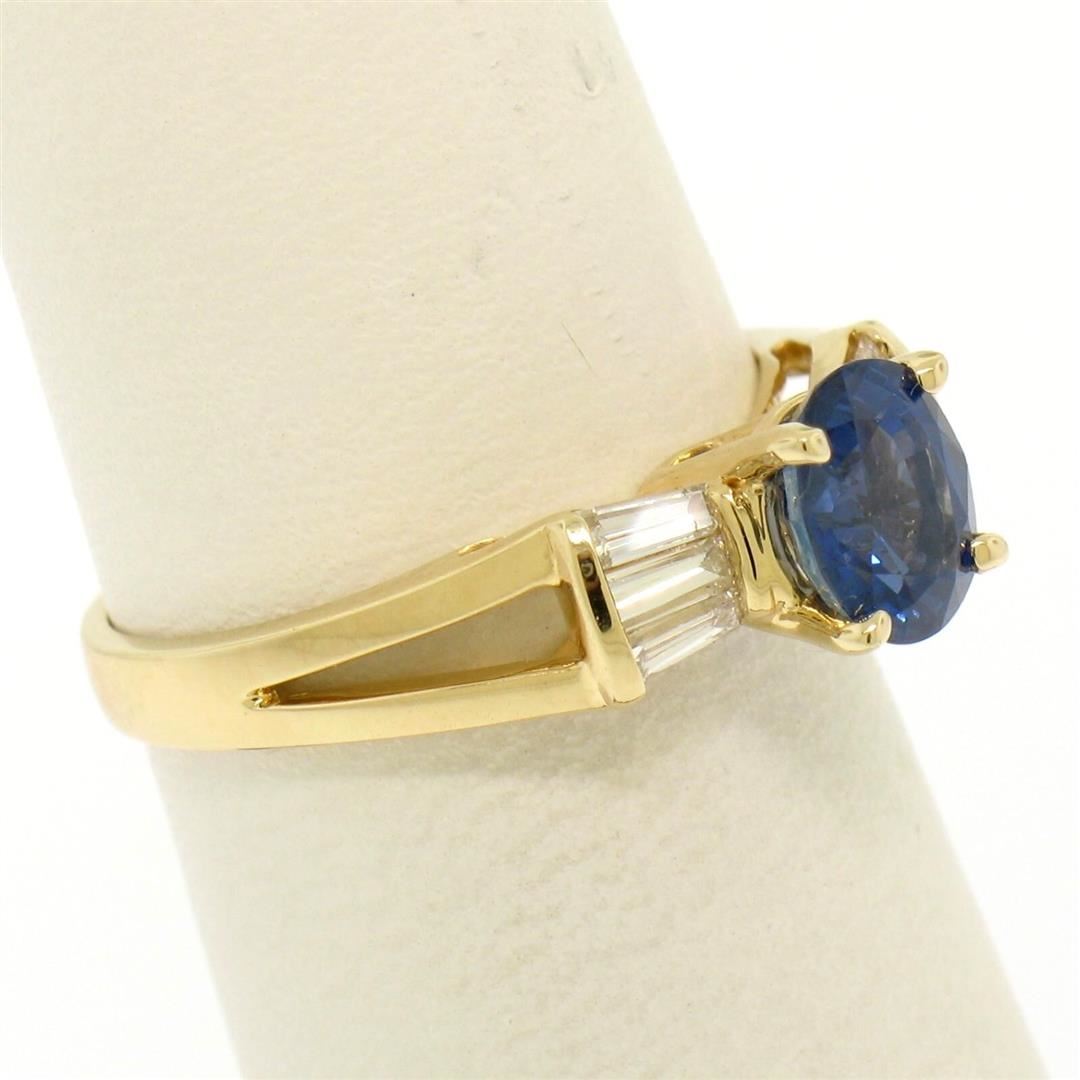 An estate solid 14k yellow gold solitaire ring, featuring 1 oval cut natural sapphire (6.77x5.65x3.82mm; 1.15ct), accented with 6 baguette cut natural diamonds (G - VS1; 0.36ctw). The ring is size 6.25, weighs a total of 2.6 grams, and measures 6.77mm wide.