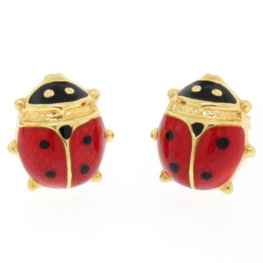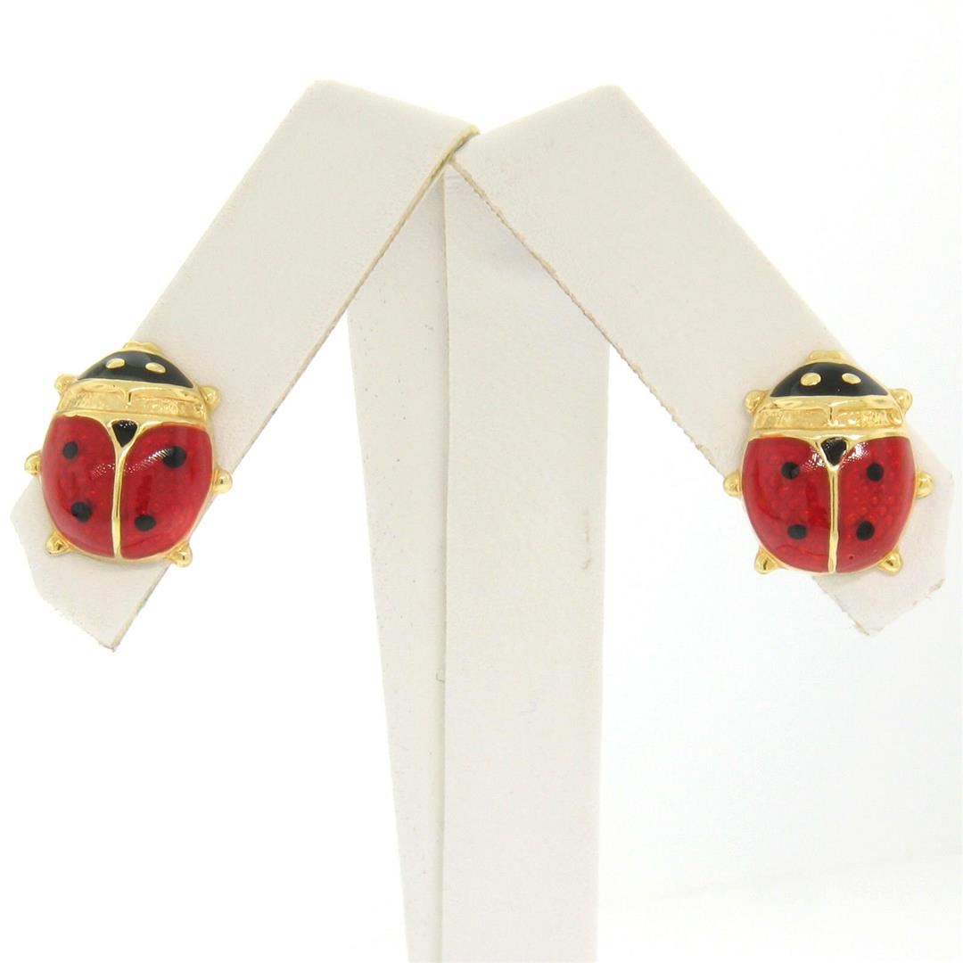 One Italian 14k Yellow Gold Red & Black Enamel Petite Lady Bug Post Stud Earrings. Item Details - Material: 14k Solid Yellow Gold, Weight: 2.6 Grams, Backing: Post Backs w/ Butterfly Fastenings (Pierced ears required.), Width: 12.5mm, Height: 13.3mm, Thickness: 5.0mm projection off the ear, Signature: Italy 14KT B, Condition: Like New!