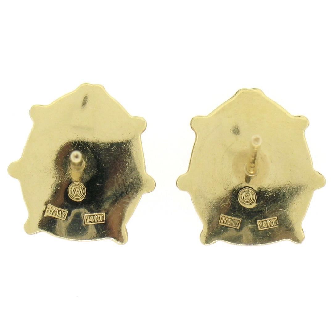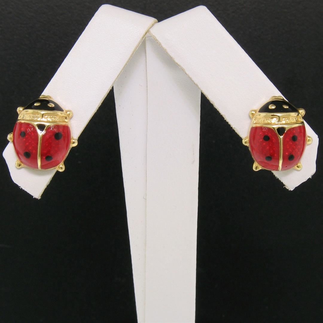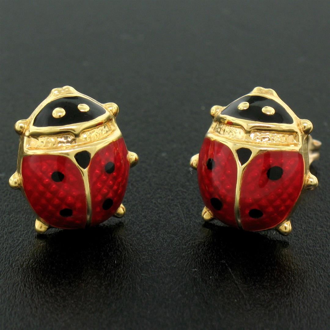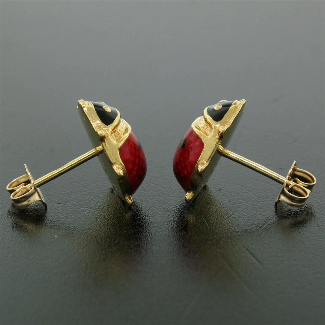 One Italian 14k Yellow Gold Red & Black Enamel Petite Lady Bug Post Stud Earrings. Item Details - Material: 14k Solid Yellow Gold, Weight: 2.6 Grams, Backing: Post Backs w/ Butterfly Fastenings (Pierced ears required.), Width: 12.5mm, Height: 13.3mm, Thickness: 5.0mm projection off the ear, Signature: Italy 14KT B, Condition: Like New!