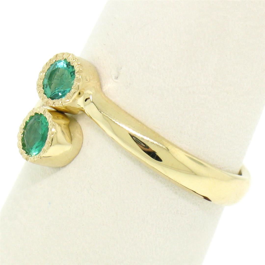 One NEW Custom 14k Yellow Gold Round Bezel Set Emerald Two Stone Simple Bypass Ring. Item Details: Material: 14k Solid Yellow Gold, Weight: 2.6 Grams, Stone(s): (2) Natural Genuine Emeralds - Round Cut - Bezel Set - Vibrant Medium Green Color - 0.30ctw, Total Carat Weight: 0.30, Ring Size: 5.75 (We can custom size this ring.), Ring Width: 9.33mm, Ring Height: 3.16mm rise off the finger, Condition: New w/o Tag