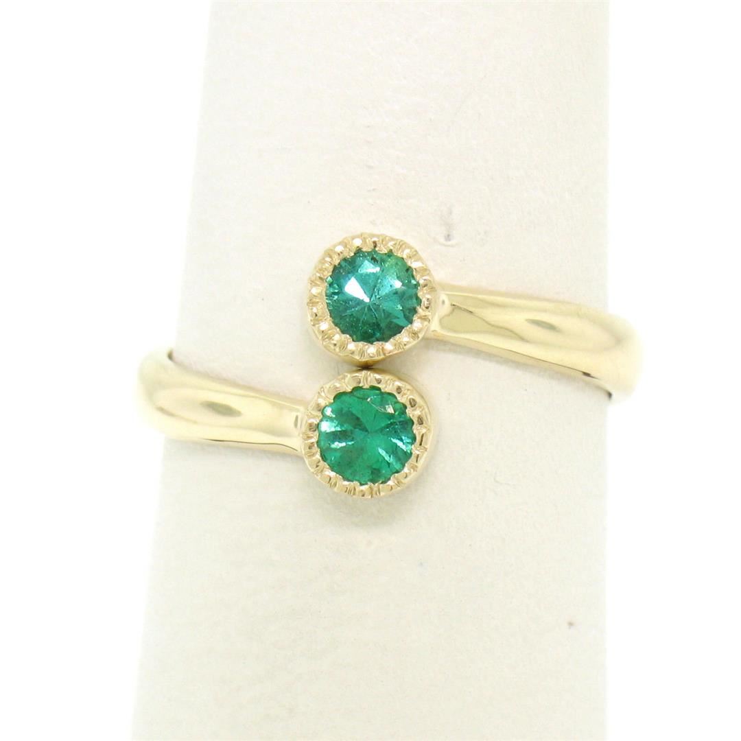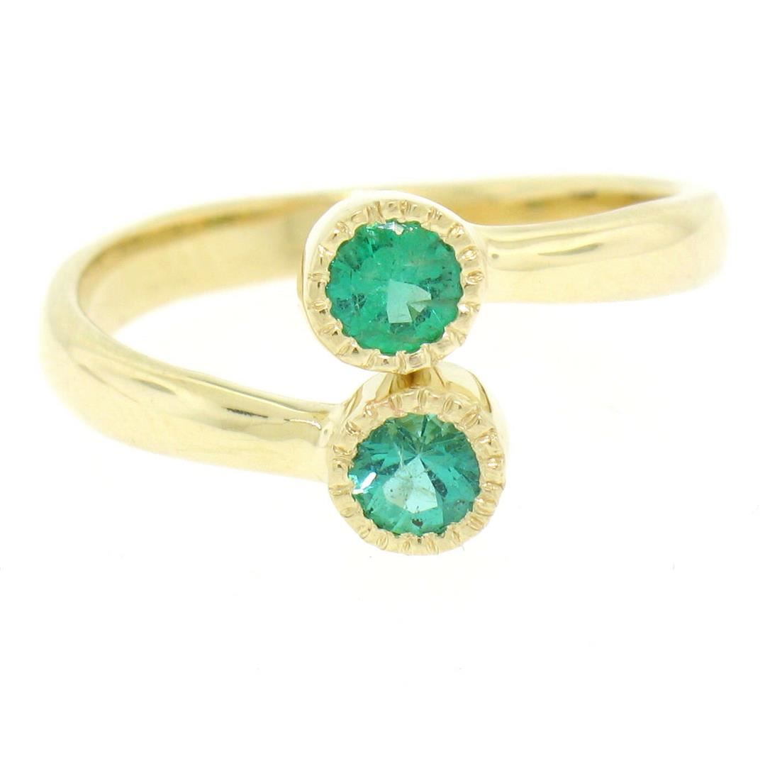 One NEW Custom 14k Yellow Gold Round Bezel Set Emerald Two Stone Simple Bypass Ring. Item Details: Material: 14k Solid Yellow Gold, Weight: 2.6 Grams, Stone(s): (2) Natural Genuine Emeralds - Round Cut - Bezel Set - Vibrant Medium Green Color - 0.30ctw, Total Carat Weight: 0.30, Ring Size: 5.75 (We can custom size this ring.), Ring Width: 9.33mm, Ring Height: 3.16mm rise off the finger, Condition: New w/o Tag