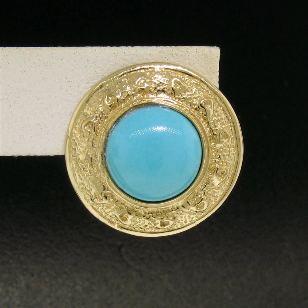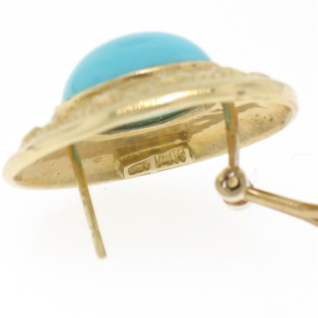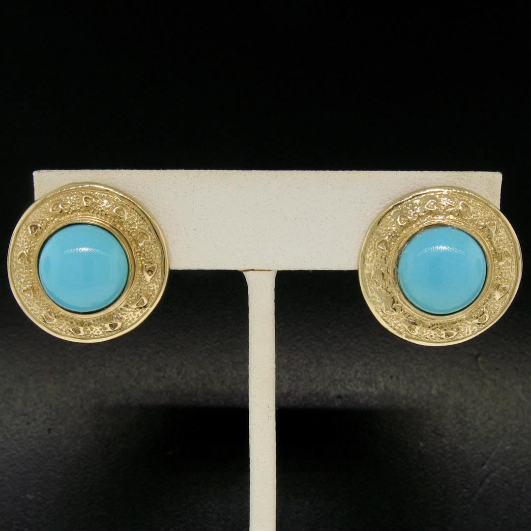 One Vintage Large Detailed 14k Yellow Gold Round Bezel Set Turquoise Button Earrings. Item Details: Material: 14k Solid Yellow Gold, Weight: 11.8 Grams, Stone(s): (2) Natural Genuine Turquoise - Round Cabochon Cut - Bezel Set - Light Turquoise Color - 12.0mm (approx.), Backing: Post Backs w/ Omega Closures, Diameter: 22.77mm, Thickness: 8.04mm, Condition: Vintage piece. Excellent condition!