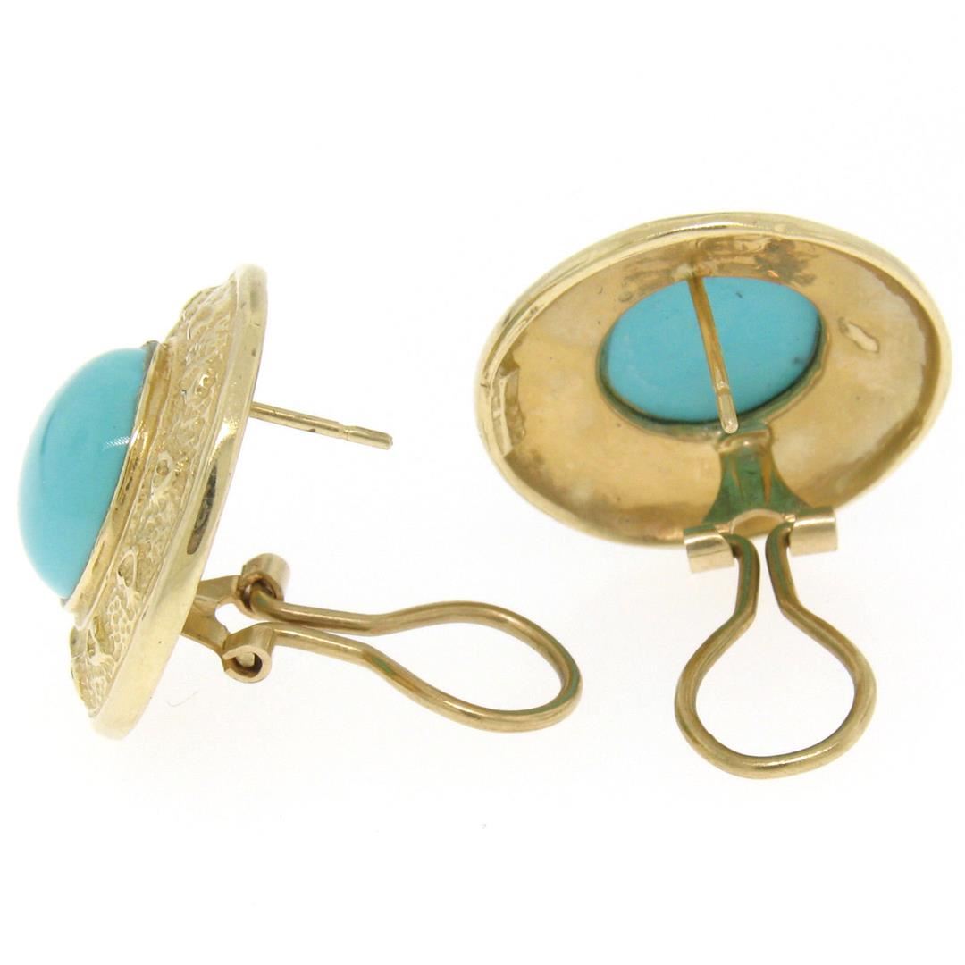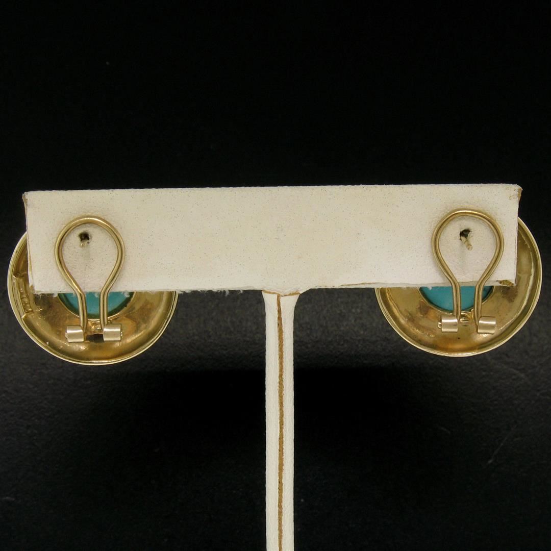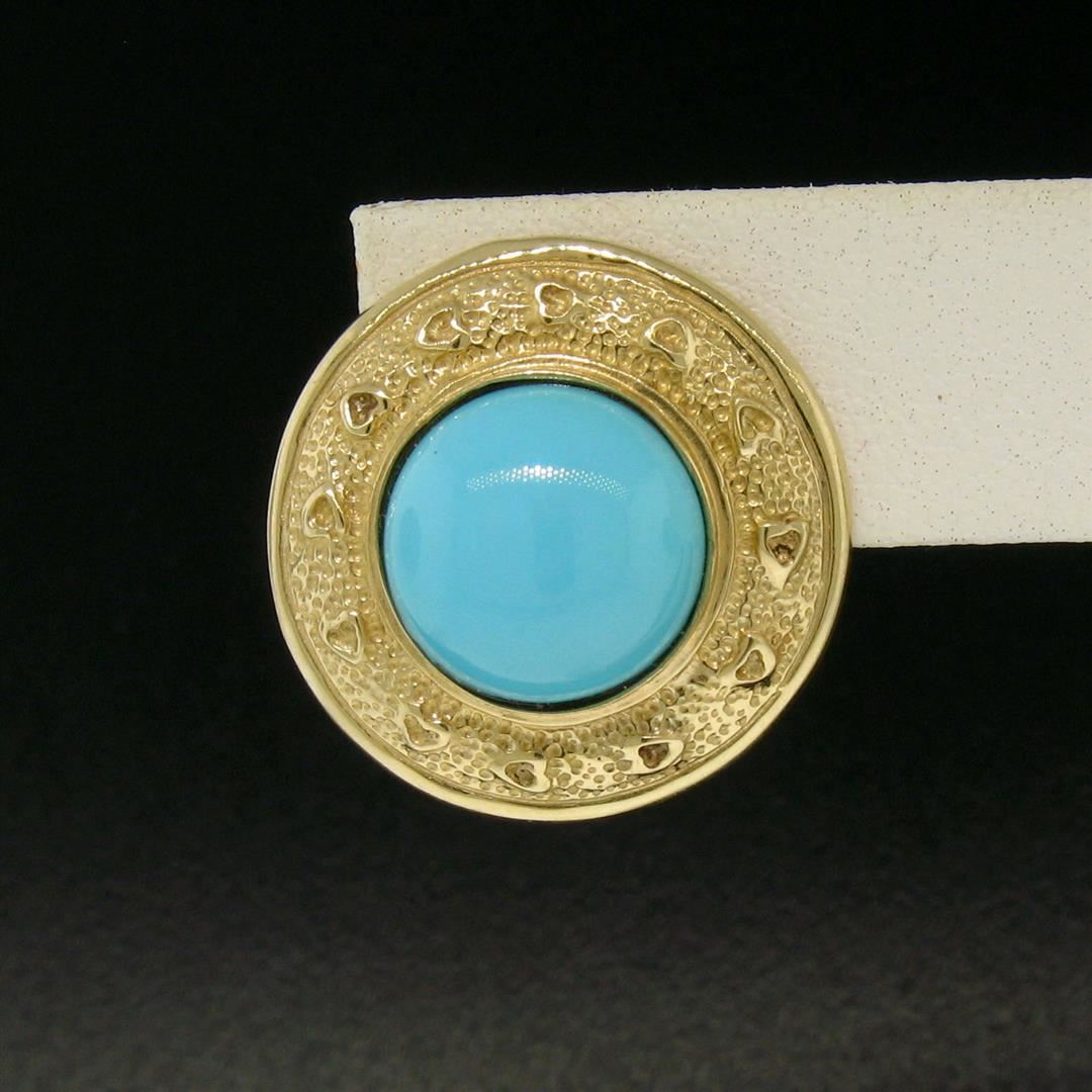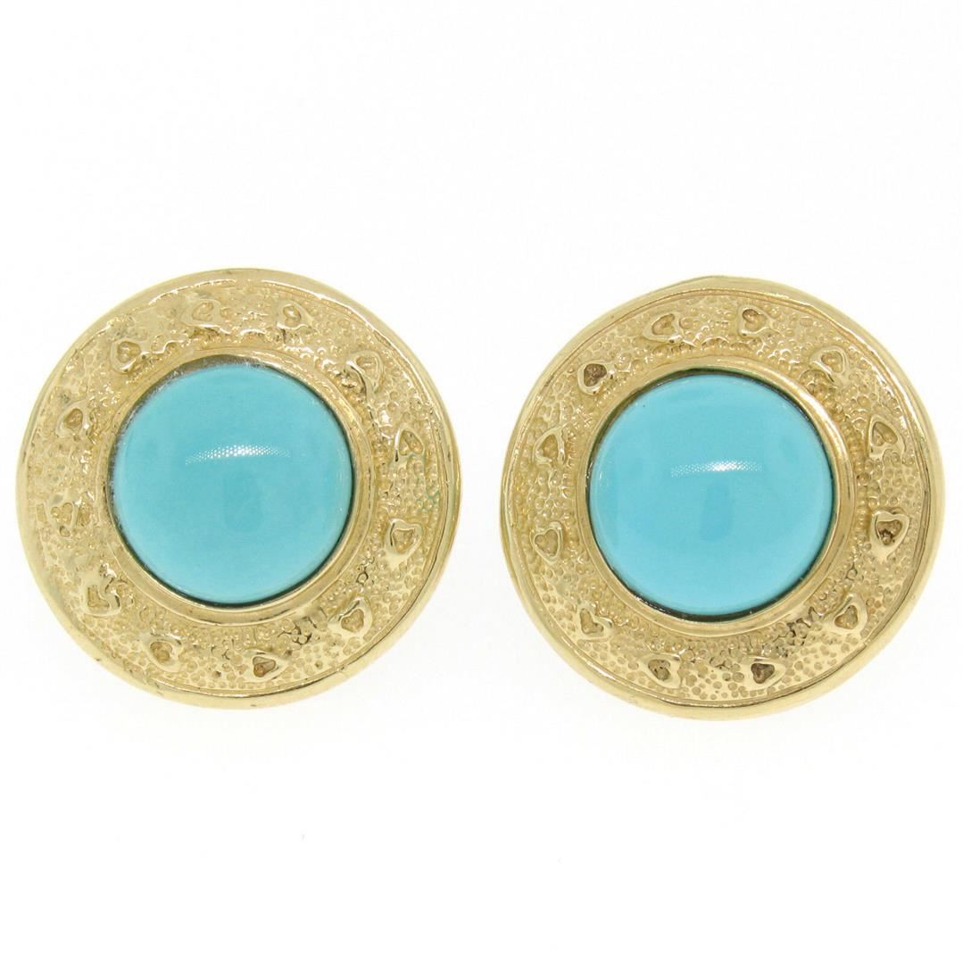 One Vintage Large Detailed 14k Yellow Gold Round Bezel Set Turquoise Button Earrings. Item Details: Material: 14k Solid Yellow Gold, Weight: 11.8 Grams, Stone(s): (2) Natural Genuine Turquoise - Round Cabochon Cut - Bezel Set - Light Turquoise Color - 12.0mm (approx.), Backing: Post Backs w/ Omega Closures, Diameter: 22.77mm, Thickness: 8.04mm, Condition: Vintage piece. Excellent condition!