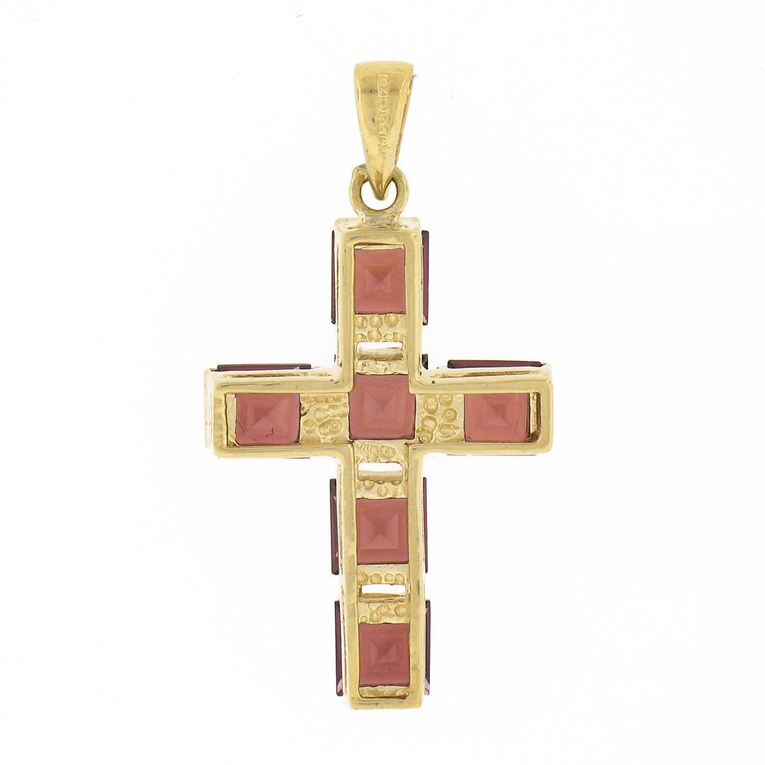 A solid 14k yellow gold cross pendant. featuring 6 square cut natural rhodolite garnets (4.1x4.1mm each). The pendant weighs a total of 2.38 grams, measures 27.40x14.60mm including the bail, and the inside of the bail measures 3.4x2.7mm.