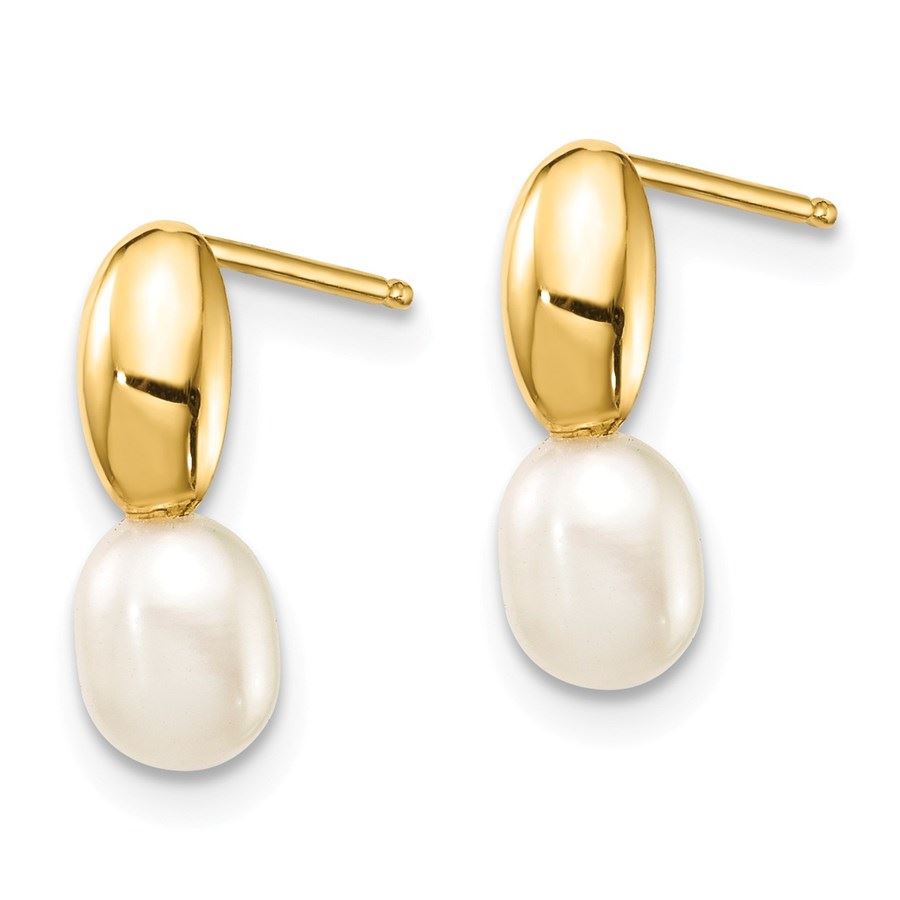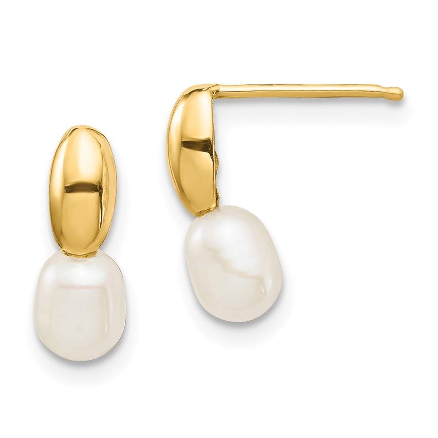14k Yellow Gold White Rice Pearl Post Dangle Earrings - 4-5 mm