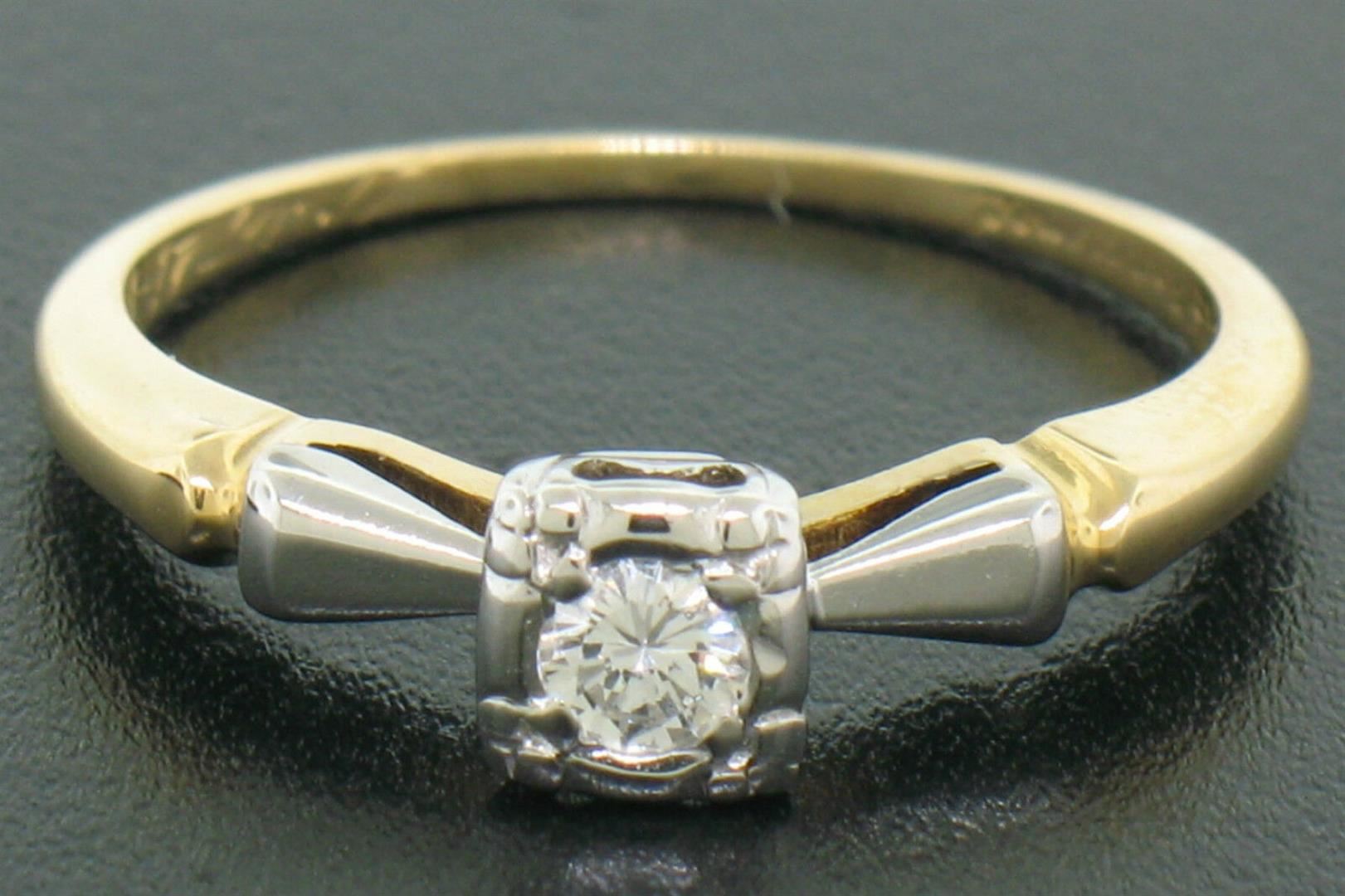 One Vintage 14k Yellow & White Gold 0.14ctw VS F Diamond Solitaire Engagement Ring. Item Details: Material: Solid 14k Yellow and White Gold, Weight: 2.10 Grams, Stone(s): (1) Natural Genuine Diamond - Round Brilliant Cut - Prong Set - F Color - VS1 Clarity, Total Carat Weight: 0.14 (approx.), Ring Size: 5.5 (We can custom size this ring.), Ring Width: 4.94mm, Condition: Vintage estate piece in excellent condition.