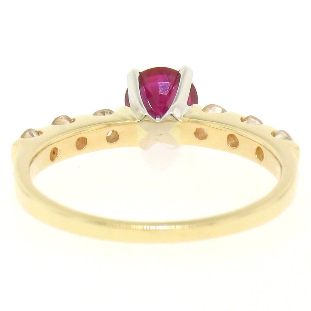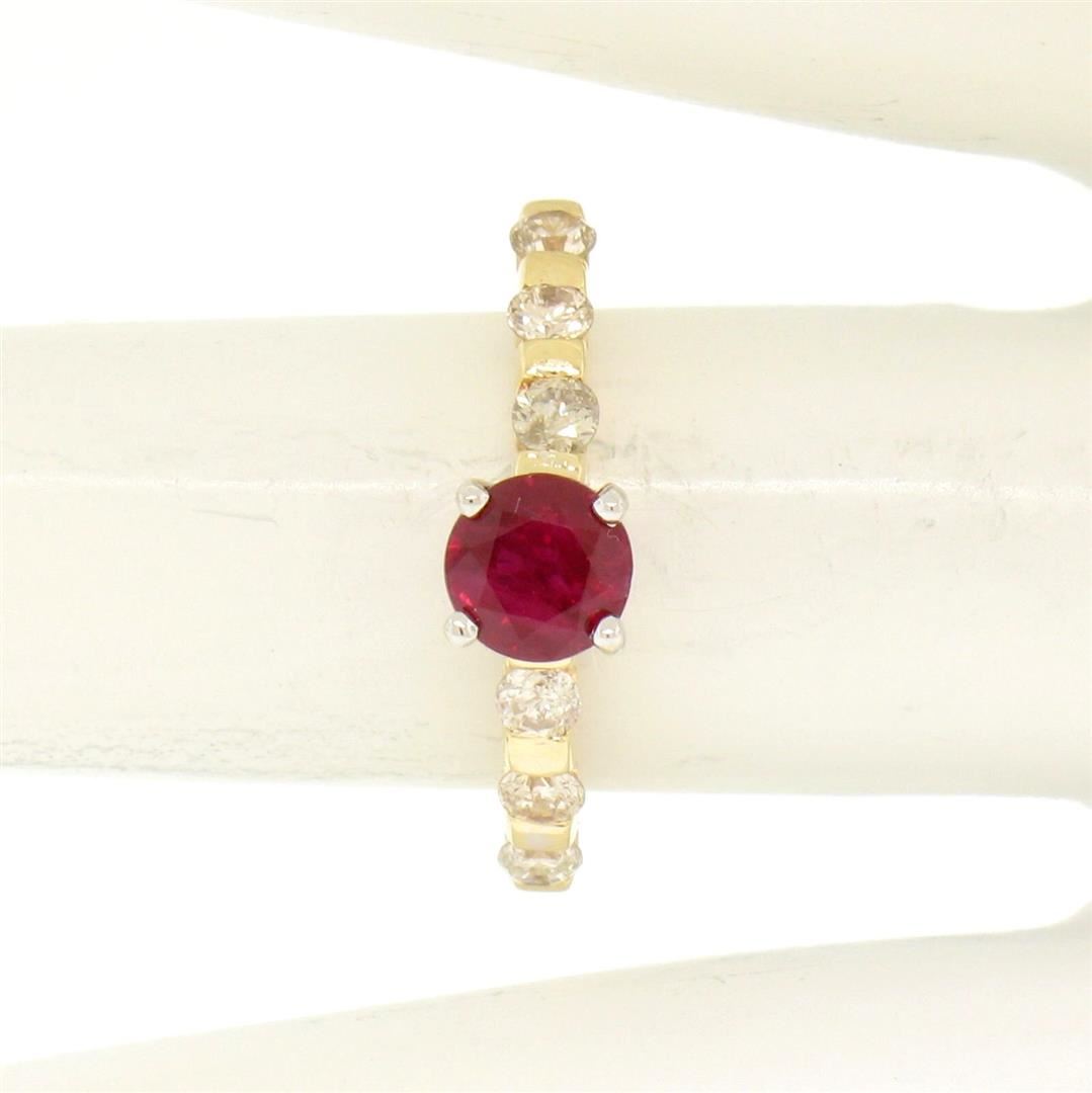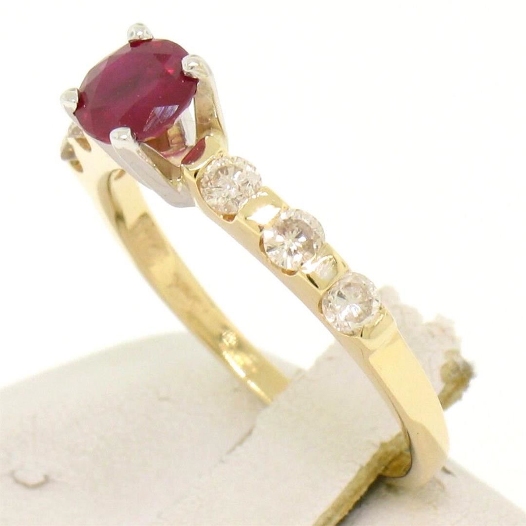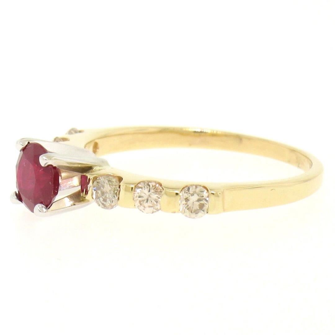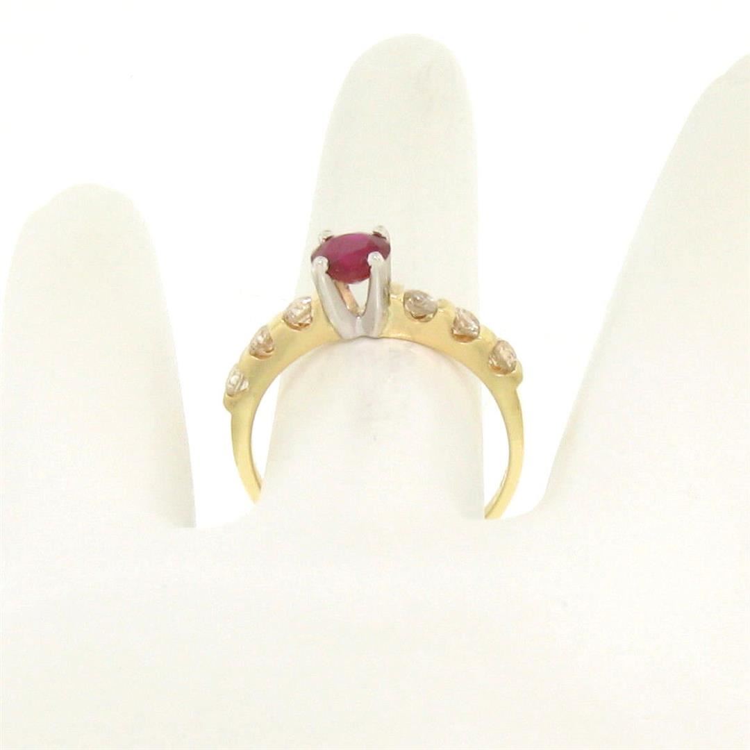 14k Yellow & White Gold 0.95ctw Round Ruby Solitaire & Diamond Engagement Ring. Please see photos and description for all available information. An estate solid 14k yellow and white gold solitaire engagement ring, featuring 1 rounf brilliant cut natural ruby (0.65ct), accented with 6 round brilliant cut natural diamonds (H/I- SI1/SI2; 0.30ctw ). The ring is size 5.5, weighs a total of 2.1 grams, and measures 5mm wide.