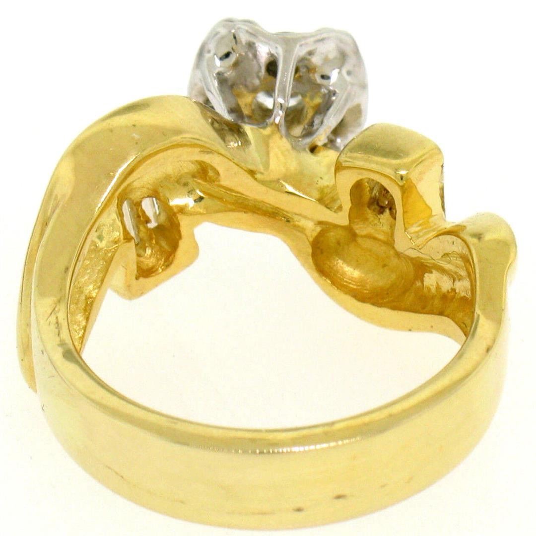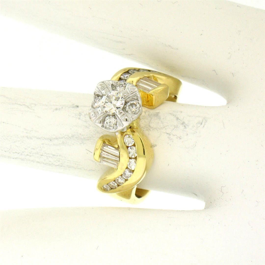 14k Yellow & White Gold 1.0ctw Fine Round & Baguette Diamond Solitaire Ring. Please see photos and description for all available information. An estate solid 14k yellow and white gold solitaire ring, featuring 19 round brilliant cut natural diamonds (F/G- VS2), and 6 baguette cut natural diamonds (F/G- VS2) (1.00ctw).The ring is size 6.0, weighs a total of 8.2 grams, and measures 21.33mm wide.