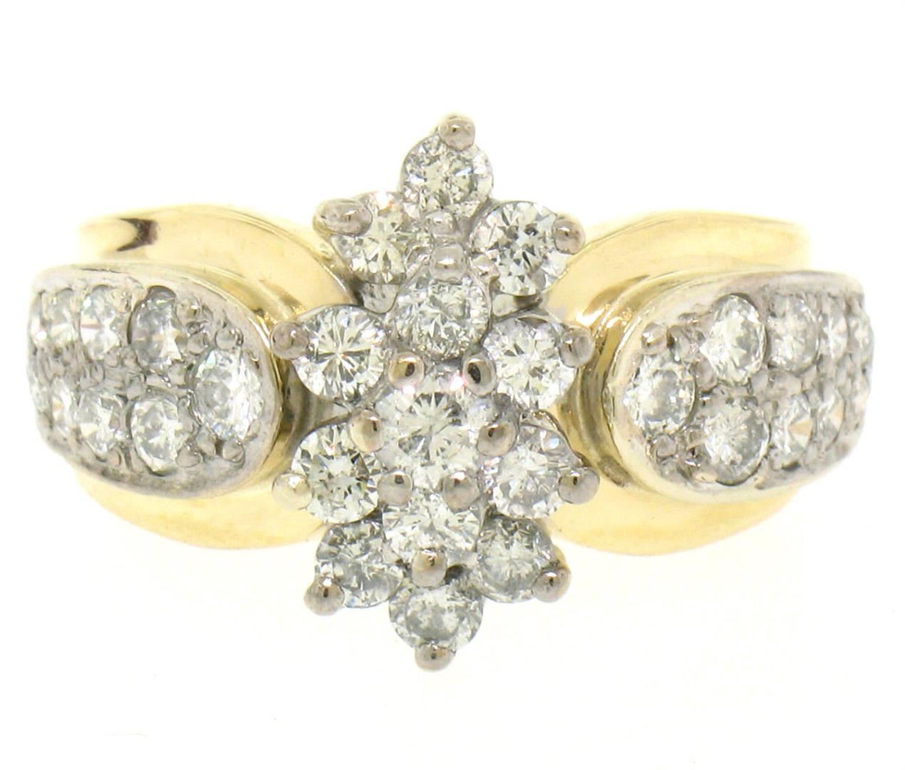 14k Yellow & White Gold 1.51ctw 33 Prong & Pave Set Round Diamond Cluster Ring. Please see photos and description for all available information. An estate solid 14k white and yellow gold cluster ring, featuring 33 round brilliant cut natural diamonds (G/H- SI1; 1.51ctw). The ring is size 7.0, weighs a total of 6.90 grams, and measures 8.41mm wide.