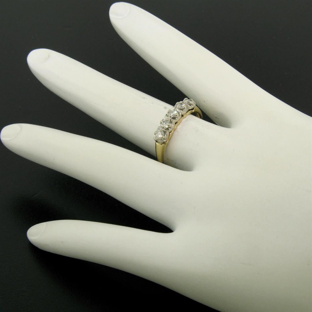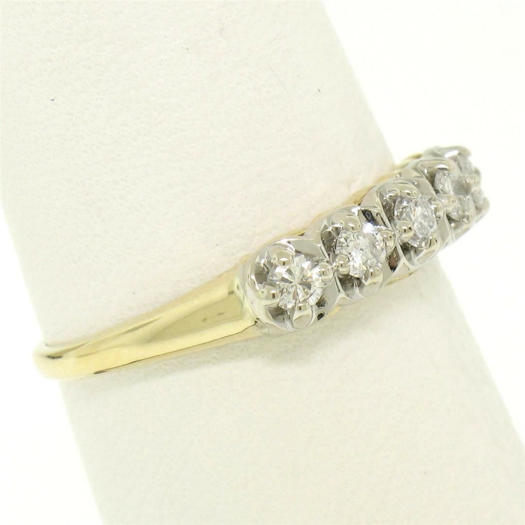 One 14k Yellow & White Gold .28ctw 5 Round Brilliant Cut Prong Set Diamond Band Ring. Item Details: Material: 14k Solid Yellow and White Gold, Weight: 2.0 Grams, Stone(s): (5) Natural Genuine Diamonds - Round Brilliant Cut - Illusion Prong Set - G Color - SI1 Clarity, Total Carat Weight: 0.28 (approx.), Ring Size: 6.75 (We can custom size this ring.), Ring Width: 4.28mm, Ring Height: 3.43mm rise off the finger, Condition: Excellent, ready to wear condition!