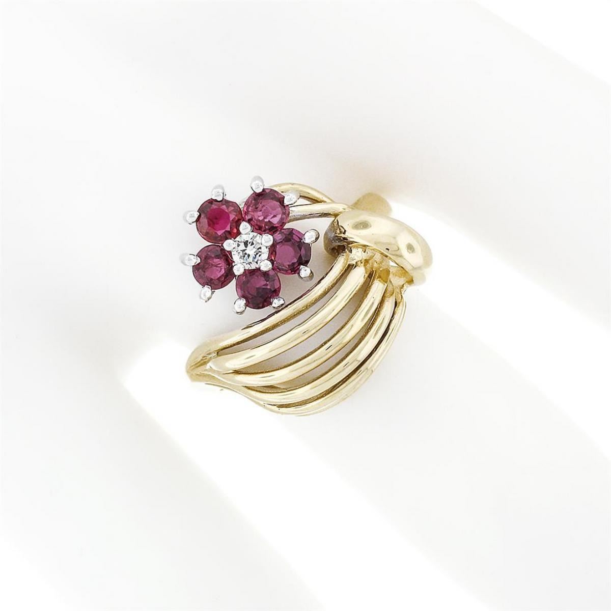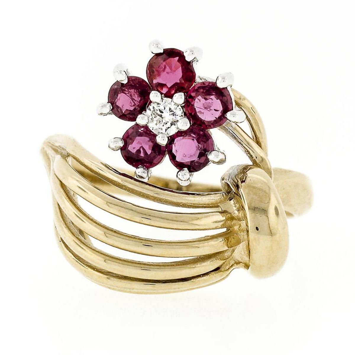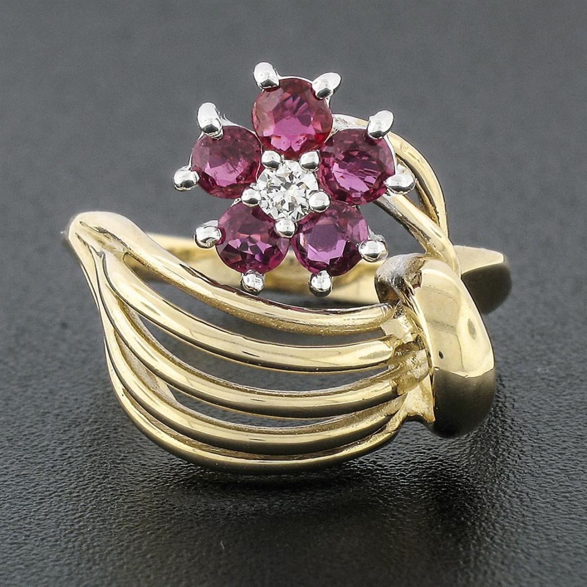 A solid 14k yellow and white gold open dome ring featuring a flower cluster made from a single round brilliant cut diamond (H - VS2; 0.05ct) surrounded by 5 round rubies (1.00ctw). The ring is size 6.0, weighs a total of 5.03 grams, and measures 16.82mm wide.