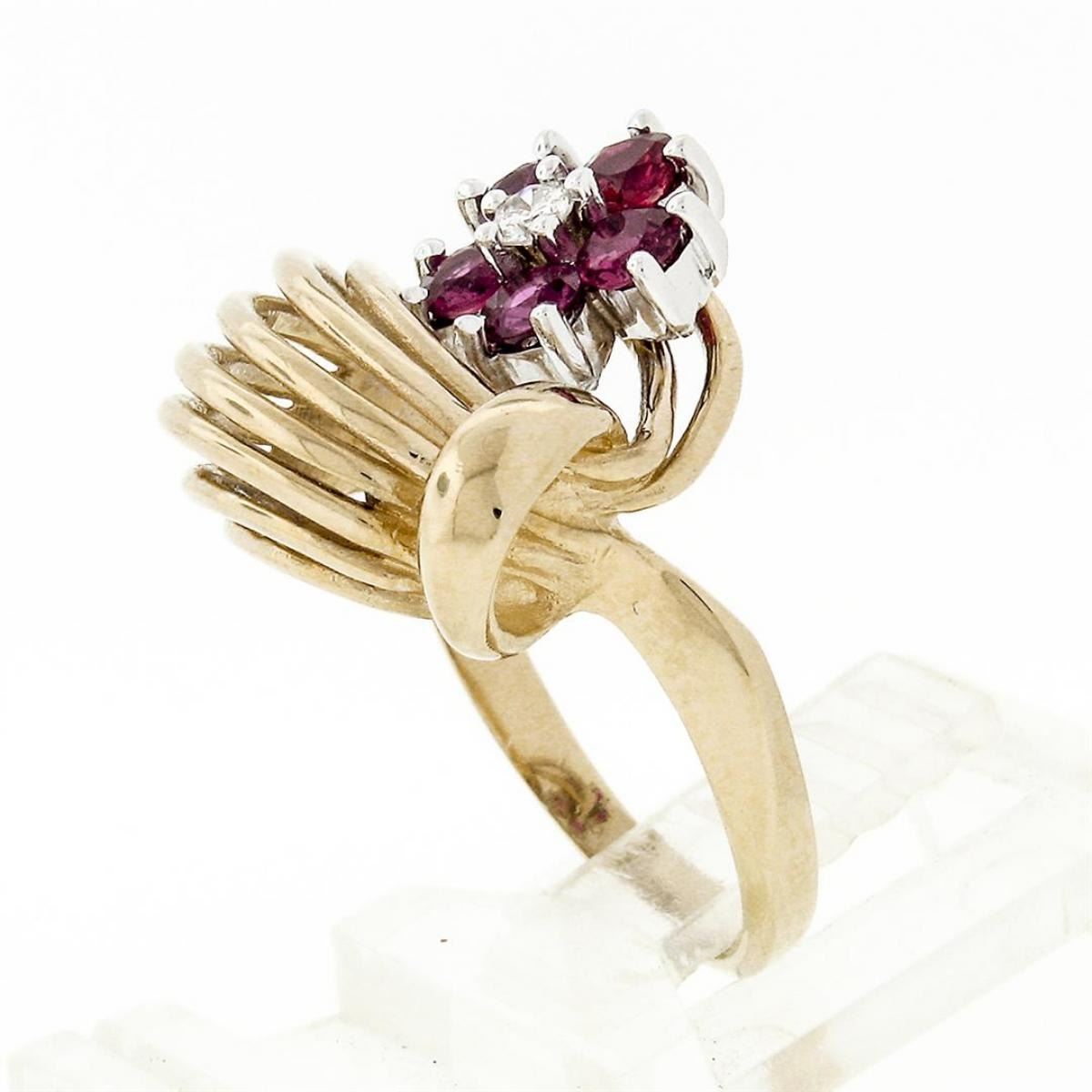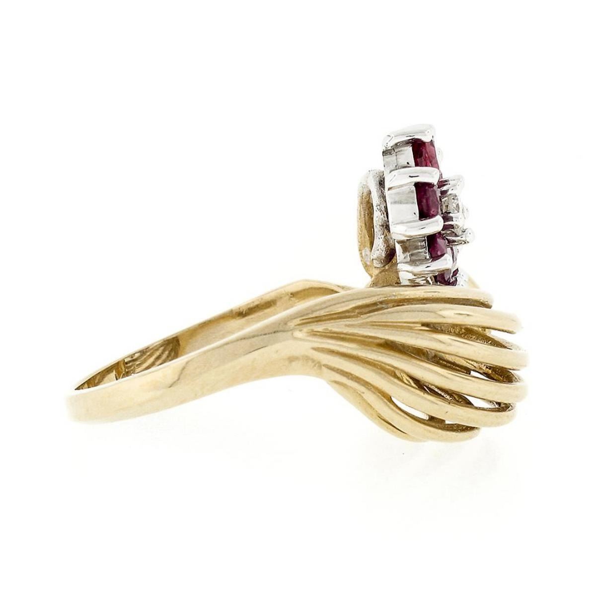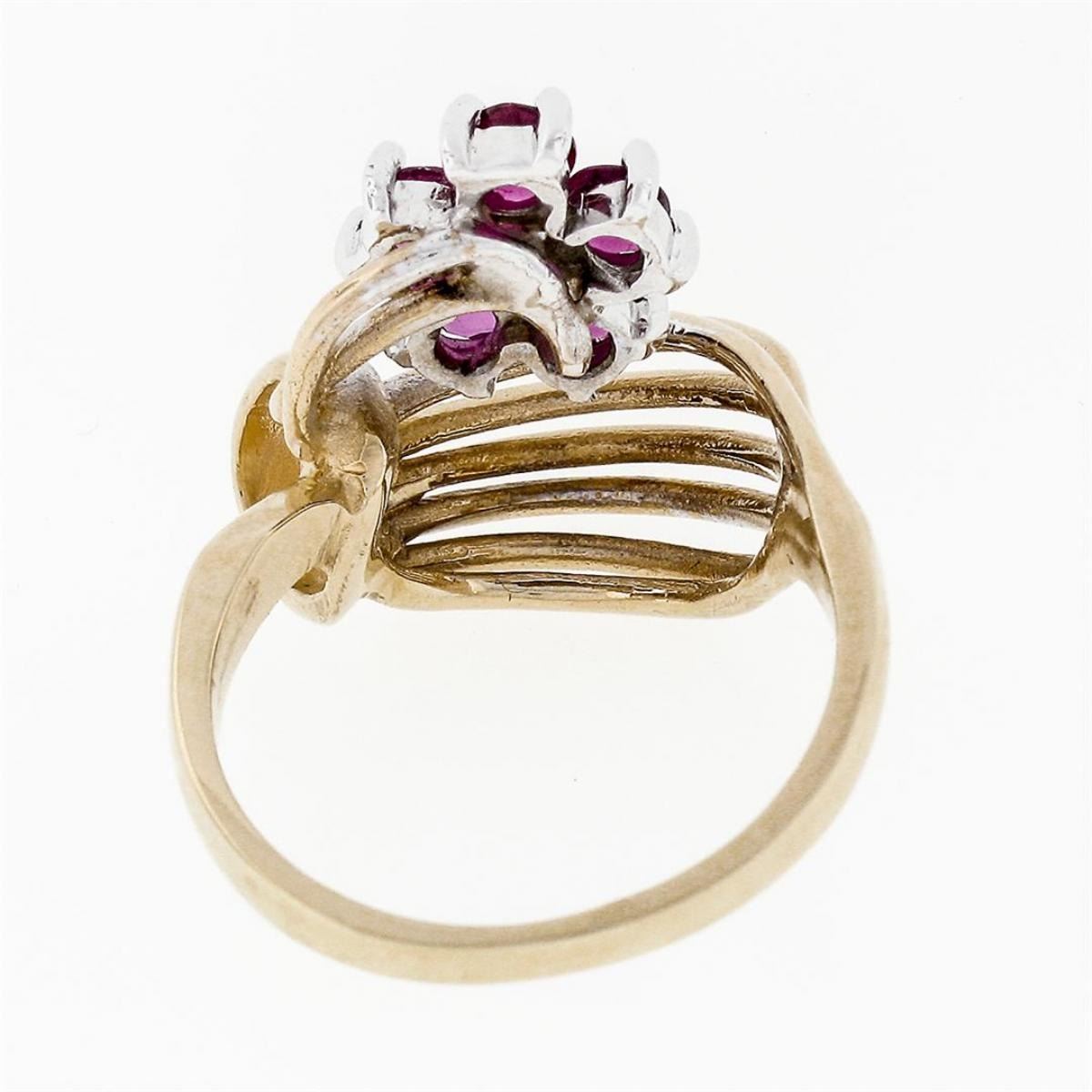 A solid 14k yellow and white gold open dome ring featuring a flower cluster made from a single round brilliant cut diamond (H - VS2; 0.05ct) surrounded by 5 round rubies (1.00ctw). The ring is size 6.0, weighs a total of 5.03 grams, and measures 16.82mm wide.