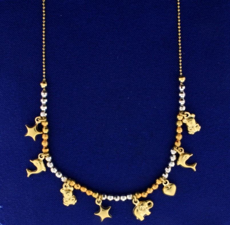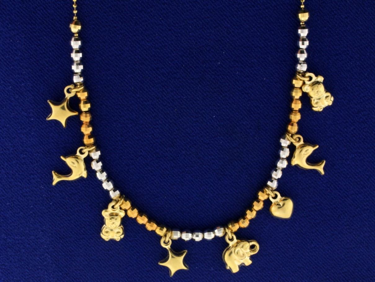 14k animal charm necklace with 8 charms including dolphins, teddy bears,elephant, hearts, and stars. Alternating yellow and white beads on necklace gives a unique look. 16 inches long. 14k lobster clasp. 7.6g.