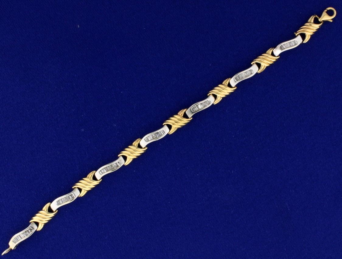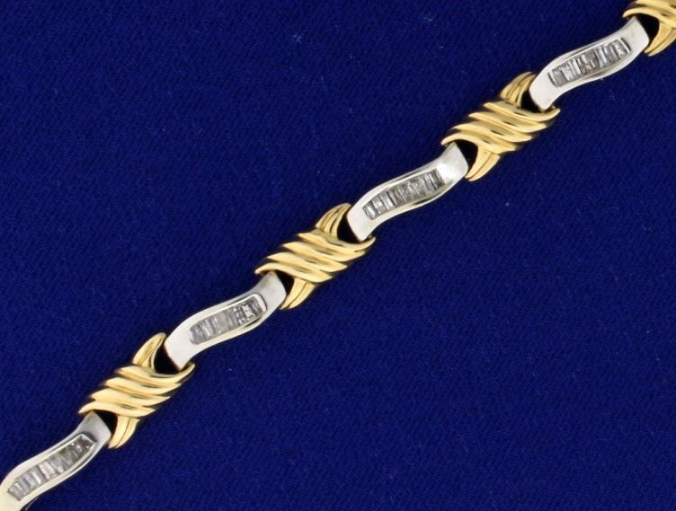 In 14k yellow and white gold. 6 3/4 inches. Contains 1.5ct TW of high quality baguette diamonds, G color/SI clarity. 11.2g