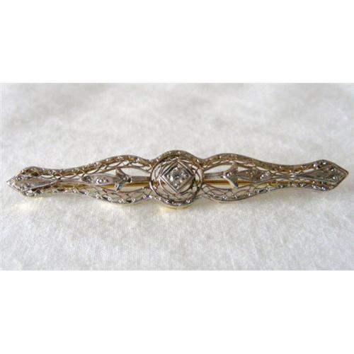 A beautiful 14k yellow gold bar pin. circa 1910. 14k White Gold Filigree work on the front with a 15pt. diamond. Victorian safety lock.2.25" long X .25" wide.
