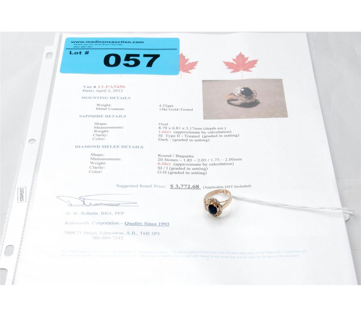 diamond ring. appraised value $3772.68