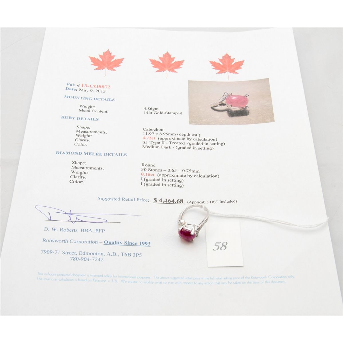 dinner ring. appraised value $4464.68