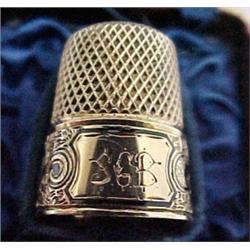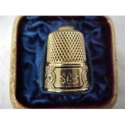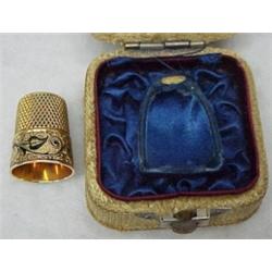 14k gold and enameled thimble, engraved and enameled banding, initialed S.G.B., in fitted cloth lined case, 4.2 d.w.t., 6.6 g. Estimate 100/150