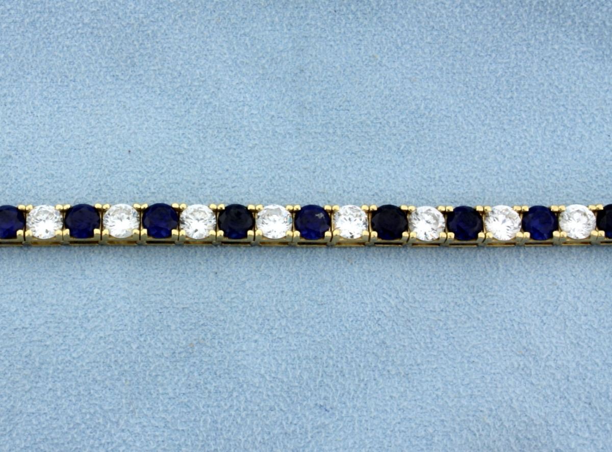 Get an amazing look for a very low price. 14k yellow gold bracelet with 17 cz and 17 lab sapphires. Looks like almost 9 ct of diamonds! 7 inches. 20.1g.