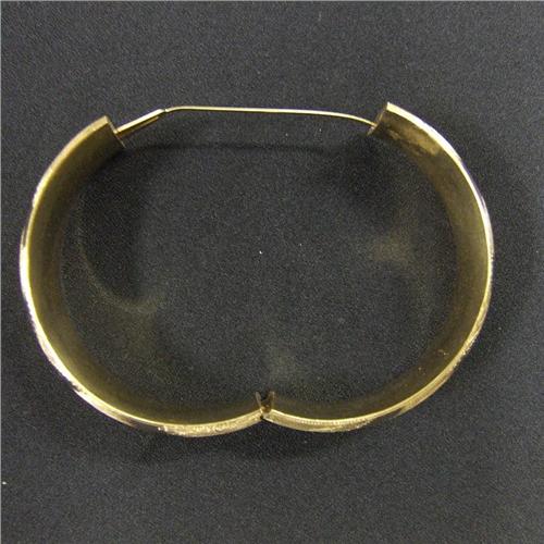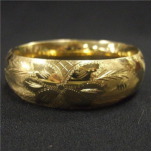 14k gold hinged bangle bracelet with engraved design measures 3/4" wide; inside circumferance is 7 1/4"; marked 14k on safety closure; late 20th C.; weight 24.6 dwt/38.2 grams