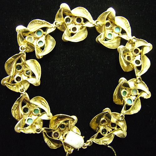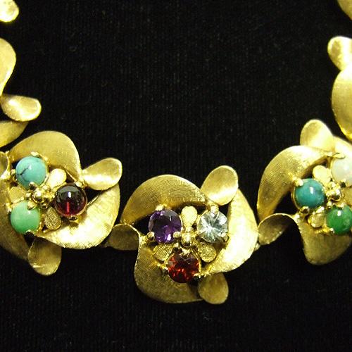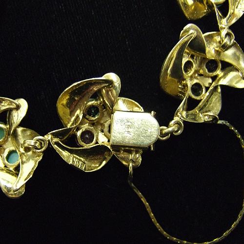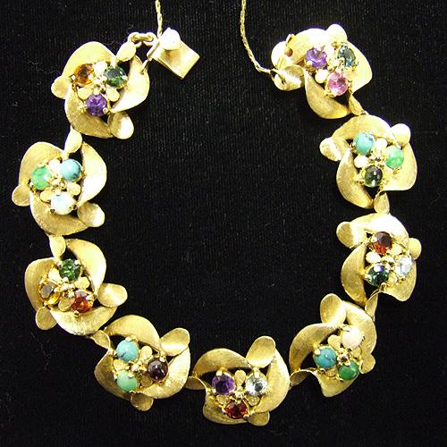 14k gold link bracelet with semi-precious stones; bracelet measures 7 1/2 long x 3/4" wide and is set with various stones including opal, jade, garnet and citrine; freeform design with brushed gold finish; attached gold safety chain; weight 21.2 dwt/33.0 grams (no visible defects)