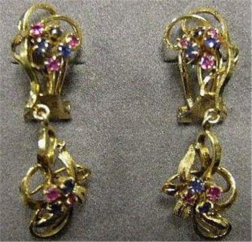 14k gold ruby and sapphire drop earrings measure 1 5/8 inches long and are each set with a total of ten small rubies and sapphires; pierced Omega backs; marked 14k; weight 5.0 dwt/7.8 grams (no visible defects)