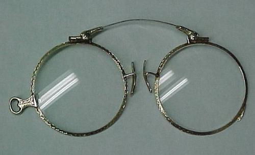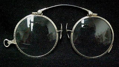 14k white gold spectacles; C. 1910 round eyeglasses with 14k white gold frame measure 3 3/4" across; has loop for chain; marked 14k; chip on edge of one lens