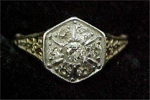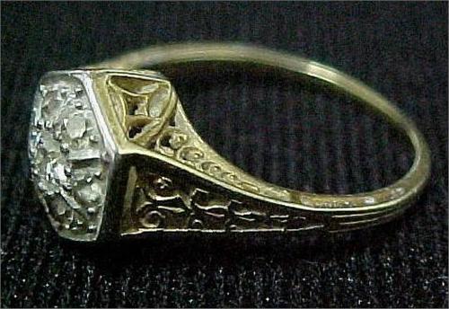 14k yellow gold filigree cluster ring, C. 1920 six sided white gold mounting set with seven mine cut diamonds; center stone measures approximately 10 points and is surrounded by six diamonds approximately 3 points each; yellow gold band is marked 14k; measures 3/8" top to bottom; size 6; weight 1.8 dwt/2.8 grams; no visible defects
