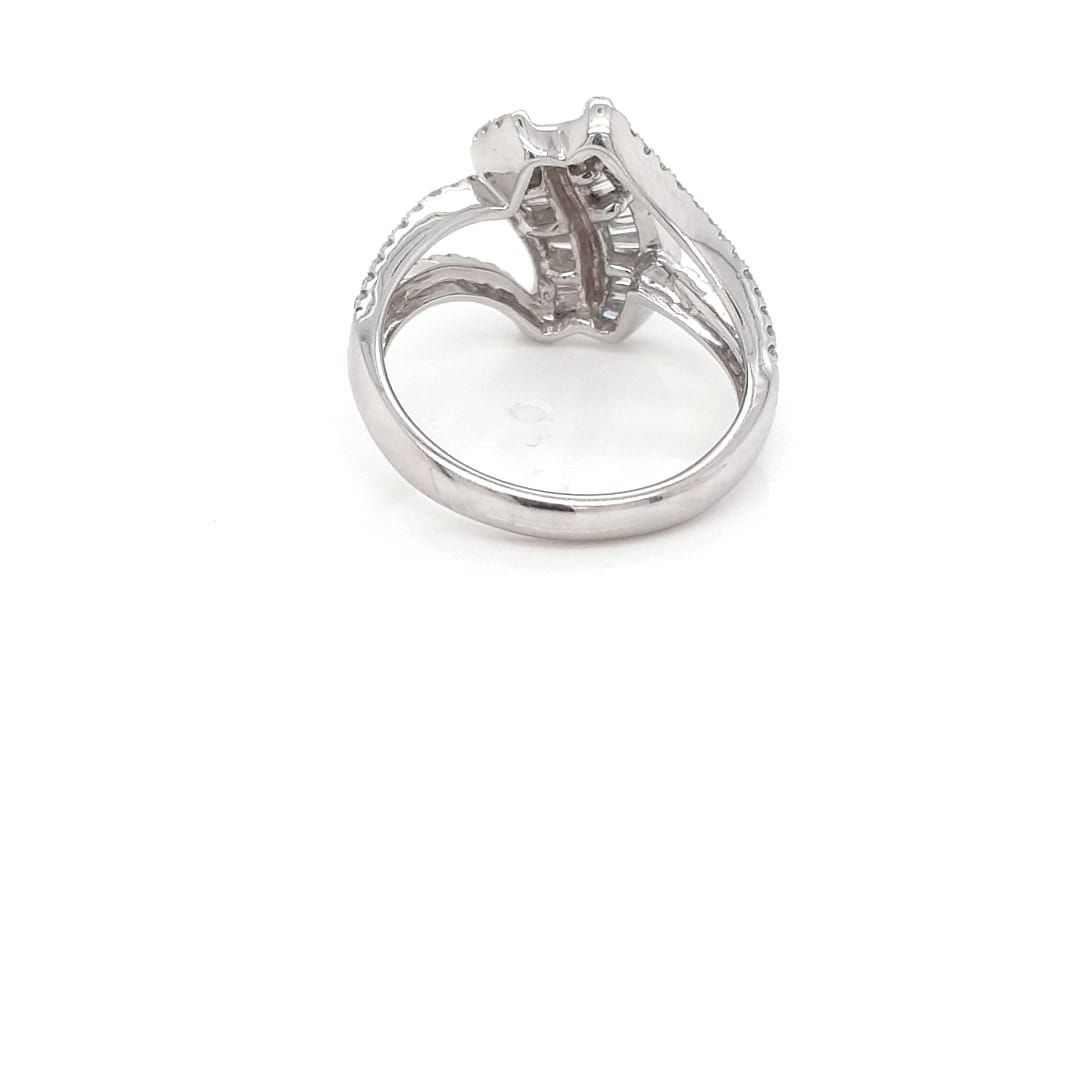 14kt White Gold Ring With Emerald cut Baguette Diamond set in the Center with Full Cut round Diamonds around it and Diamonds set half way on the ring.