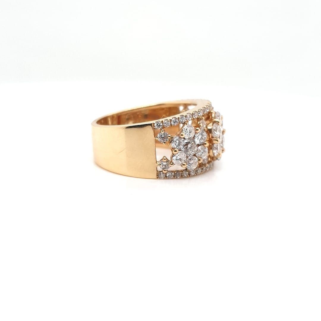 14Kt Yellow gold Diamond Ring with Full Cut Round Diamonds in center as flower Design and diamonds on either side of the Flower Design.