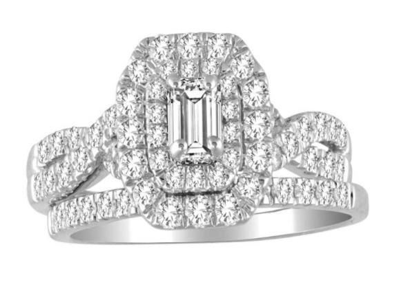 14kt solataire Diamond Ring with a Emerald cut shape Diamond in the Center with a double "halo" around with full cut round Diaomonds Half way on the intertwined band and it Comes with a FREE Band.