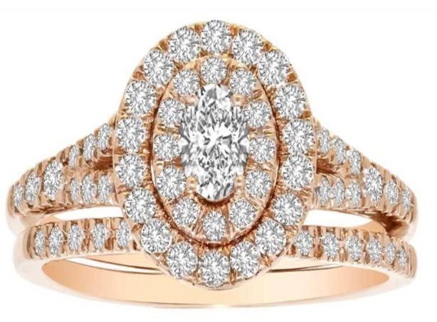 14kt Rose Gold solataire Ring with a Oval shape Diamond in the Center with a double "halo" around with full cut round Diamonds with Diaomonds Half way on the band Shear Prong Setting , Comes with a FREE Band.